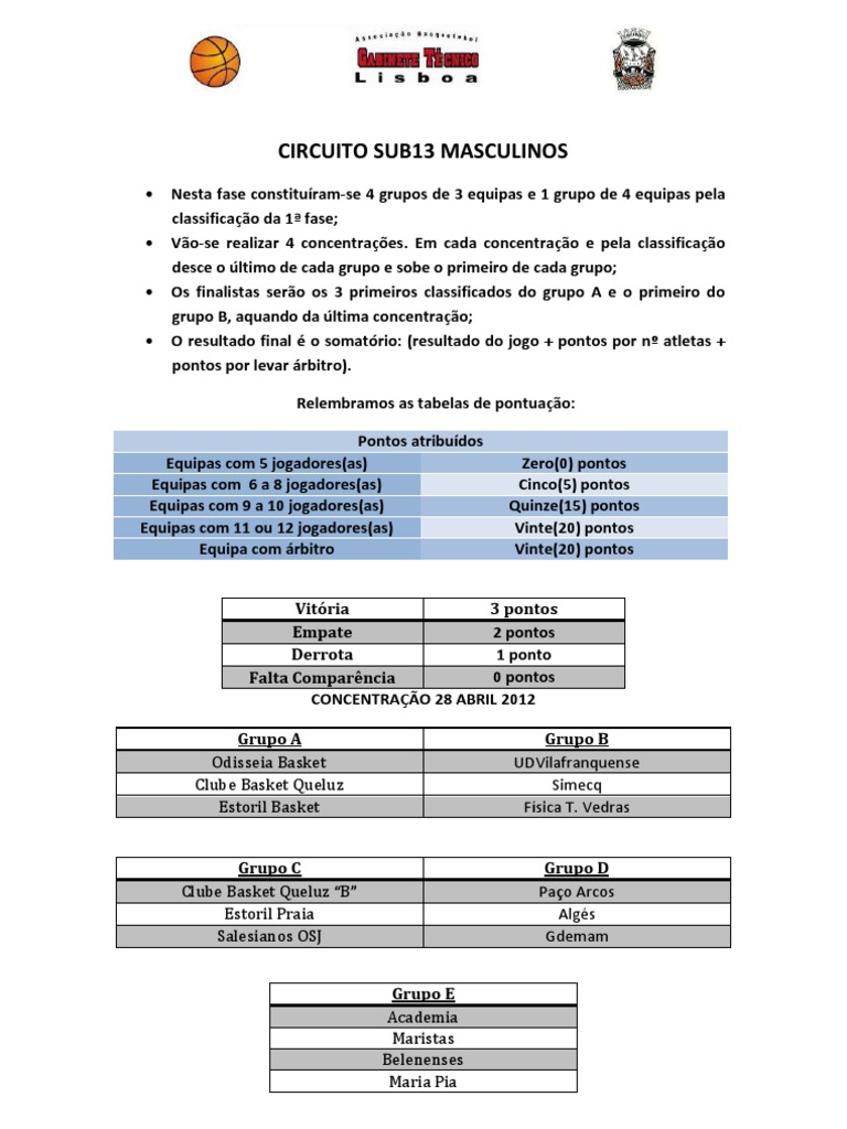 Vitria 3 pontos 2 pontos Empate 1 ponto Derrota 0 pontos Falta Comparncia CONCENTRAO 28 ABRIL 2012 Grupo A Odisseia Basket Clube Basket Queluz Estoril Basket Grupo C Clube Basket Queluz B Estoril Praia Salesianos OSJ Grupo E Academia Maristas Belenenses Maria Pia Grupo B UDVilafranquense Simecq Fsica T. Vedras Grupo D Pao Arcos Algs Gdemam