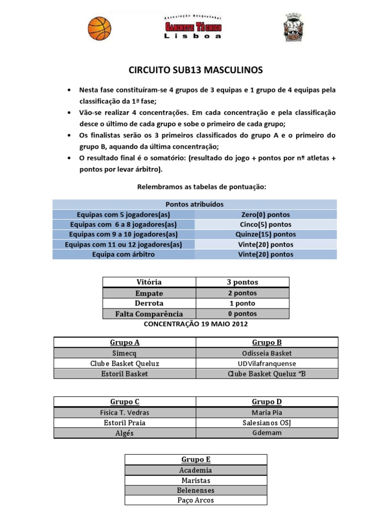 Vitria 3 pontos 2 pontos Empate 1 ponto Derrota 0 pontos Falta Comparncia CONCENTRAO 19 MAIO 2012 Grupo A Simecq Clube Basket Queluz Estoril Basket Grupo C Fsica T. Vedras Estoril Praia Algs Grupo E Academia Maristas Belenenses Pao Arcos Grupo B Odisseia Basket UDVilafranquense Clube Basket Queluz B Grupo D Maria Pia Salesianos OSJ Gdemam