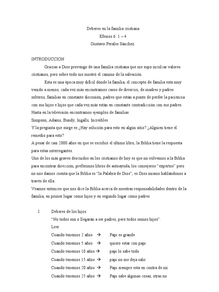 Los nios quieren ser como su pap o mam, aunque de grande ya no nos Dentro de las instrucciones que menciona el apstol Pablo, vemos que en primer lugar se dirige a nosotros, los hijos. A. Obedecer. Ef 6:1 Hijos, obedeced en el Seor a vuestros padres, porque esto es justo. Qu es obedecer? Cumplir la voluntad de alguien que ordena o manda. Diccionario enciclopdico ilustrado SOPENA. Es interesante notar como ha medido que crecemos se nos hace ms difcil obedecer. Los nios pequeos por lo general estn siempre dispuestos a obedecer, pero cuando entramos en la etapa de la adolescencia, uhmmmmmmm. 1. En el Seor. Nosotros no debemos obedecer por temor o por conveniencia. Nuestra obediencia debe ser el resultado de nuestro amor y devocin a Jesucristo. En respuesta a l, por amor a l y como siervos de l es que debemos obedecer a nuestros padres. 2. Es justo. En segundo lugar nos dice que debemos obedecer porque eso es lo correcto. Muchas veces nos preguntamos en la vida, qu es correcto y qu es incorrecto? Pues obedecer a nuestros padres es lo correcto. Es lo que debemos hacer. Cunto sufrimiento evitaramos a nuestros familiares y a nosotros mismo si cumplisemos lo que dice la Biblia. A continuacin Pablo hace mencin al Antiguo Testamento y cita Ex 20: 12. "Honra a tu padre y a tu madre, para que tus das se alarguen en la tierra que Jehov, tu Dios, te da. Este debe ser, despus de Salmo 23:1 y 4:8, uno de los primeros versculos aprendidos. Contar sobre la maestra de primaria.