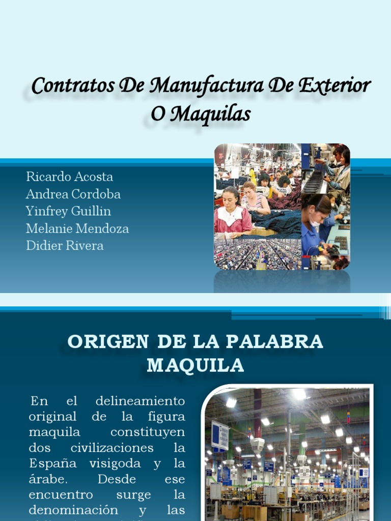 Porque su denominacin surge indirectamente del sistema de maquilas habla de operaciones de maquilas, por el tipo ejecucin de fabricacin para la exportacin. Operaciones de maquilas proceso de adicin de un valor agregado nacional a las materias primas e insumos importados temporalmente para ser exportados en su totalidad. Esta actividad se ha basado en la prctica de Comercio Exterior o integracin internacional.
