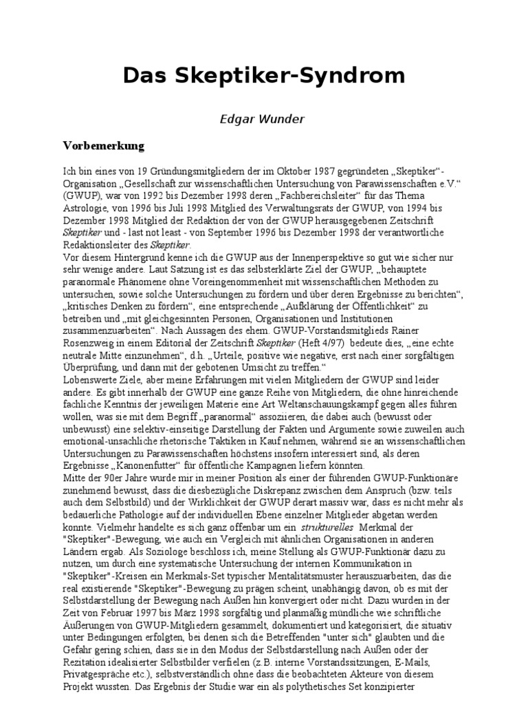 Ich bin eines von 19 Grndungsmitgliedern der im Oktober 1987 gegrndeten SkeptikerOrganisation Gesellschaft zur wissenschaftlichen Untersuchung von Parawissenschaften e.V. (GWUP), war von 1992 bis Dezember 1998 deren Fachbereichsleiter fr das Thema Astrologie, von 1996 bis Juli 1998 Mitglied des Verwaltungsrats der GWUP, von 1994 bis Dezember 1998 Mitglied der Redaktion der von der GWUP herausgegebenen Zeitschrift Skeptiker und - last not least - von September 1996 bis Dezember 1998 der verantwortliche Redaktionsleiter des Skeptiker. Vor diesem Hintergrund kenne ich die GWUP aus der Innenperspektive so gut wie sicher nur sehr wenige andere. Laut Satzung ist es das selbsterklrte Ziel der GWUP, behauptete paranormale Phnomene ohne Voreingenommenheit mit wissenschaftlichen Methoden zu untersuchen, sowie solche Untersuchungen zu frdern und ber deren Ergebnisse zu berichten, kritisches Denken zu frdern, eine entsprechende Aufklrung der ffentlichkeit zu betreiben und mit gleichgesinnten Personen, Organisationen und Institutionen zusammenzuarbeiten. Nach Aussagen des ehem. GWUP-Vorstandsmitglieds Rainer Rosenzweig in einem Editorial der Zeitschrift Skeptiker (Heft 4/97) bedeute dies, eine echte neutrale Mitte einzunehmen, d.h. Urteile, positive wie negative, erst nach einer sorgfltigen berprfung, und dann mit der gebotenen Umsicht zu treffen. Lobenswerte Ziele, aber meine Erfahrungen mit vielen Mitgliedern der GWUP sind leider andere. Es gibt innerhalb der GWUP eine ganze Reihe von Mitgliedern, die ohne hinreichende fachliche Kenntnis der jeweiligen Materie eine Art Weltanschauungskampf gegen alles fhren wollen, was sie mit dem Begriff paranormal assoziieren, die dabei auch (bewusst oder unbewusst) eine selektiv-einseitige Darstellung der Fakten und Argumente sowie zuweilen auch emotional-unsachliche rhetorische Taktiken in Kauf nehmen, whrend sie an wissenschaftlichen Untersuchungen zu Parawissenschaften hchstens insofern interessiert sind, als deren Ergebnisse Kanonenfutter fr ffentliche Kampagnen liefern knnten. Mitte der 90er Jahre wurde mir in meiner Position als einer der fhrenden GWUP-Funktionre zunehmend bewusst, dass die diesbezgliche Diskrepanz zwischen dem Anspruch (bzw. teils auch dem Selbstbild) und der Wirklichkeit der GWUP derart massiv war, dass es nicht mehr als bedauerliche Pathologie auf der individuellen Ebene einzelner Mitglieder abgetan werden konnte. Vielmehr handelte es sich ganz offenbar um ein strukturelles Merkmal der "Skeptiker"-Bewegung, wie auch ein Vergleich mit hnlichen Organisationen in anderen Lndern ergab. Als Soziologe beschloss ich, meine Stellung als GWUP-Funktionr dazu zu nutzen, um durch eine systematische Untersuchung der internen Kommunikation in "Skeptiker"-Kreisen ein Merkmals-Set typischer Mentalittsmuster herauszuarbeiten, das die real existierende "Skeptiker"-Bewegung zu prgen scheint, unabhngig davon, ob es mit der Selbstdarstellung der Bewegung nach Auen hin konvergiert oder nicht. Dazu wurden in der Zeit von Februar 1997 bis Mrz 1998 sorgfltig und planmig mndliche wie schriftliche uerungen von GWUP-Mitgliedern gesammelt, dokumentiert und kategorisiert, die situativ unter Bedingungen erfolgten, bei denen sich die Betreffenden "unter sich" glaubten und die Gefahr gering schien, dass sie in den Modus der Selbstdarstellung nach Auen oder der Rezitation idealisierter Selbstbilder verfielen (z.B. interne Vorstandssitzungen, E-Mails, Privatgesprche etc.), selbstverstndlich ohne dass die beobachteten Akteure von diesem Projekt wussten. Das Ergebnis der Studie war ein als polythetisches Set konzipierter