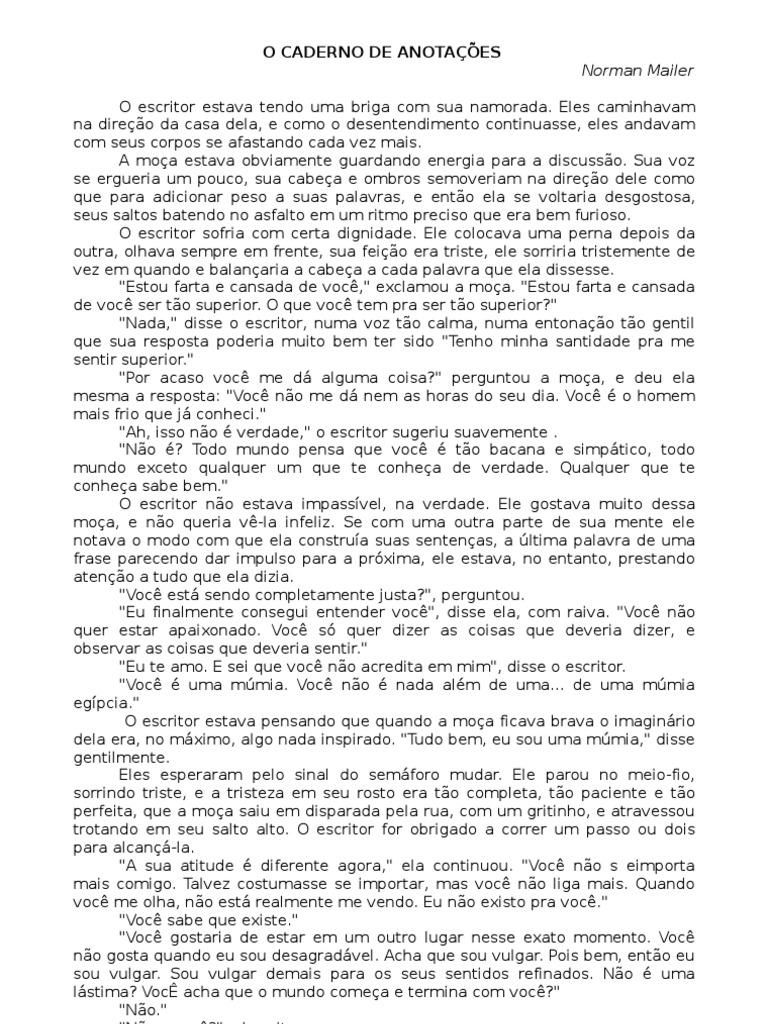 "Por que voc est irritada? porque voc sente que eu no te dei bastante ateno hoje noite? Desculpe se no dei. No percebi que no tinha dado. Eu amo voc sim." "Ah, voc me ama; ah voc certamente ama," disse a moa, numa voz to pesada de sarcasmo que ela estava quase chorando. "Talvez eu goste de pensar que sim, mas eu sei muito bem." A imagem dela repousou na dele enquanto caminhavam. "H uma coisa que vou te dizer", ela prosseguiu, amargamente. "Voc machuca os outros mais do que poderia a pessoa mais cruel do mundo. E por qu? Vou lhe dizer por qu. Porque voc nunca sente nada e faz de conta que sente." Ela podia ver que ele no estava ouvindo, e perguntou exasperada: "No que voc est pensando agora?" "Em nada. Estou escutando voc e queria que no estivesse to zangada." Na realidade, ele tinha ficado bastante inquieto. Acabara de ter uma ideia para colocar no caderno de anotaes, e isso o deixou ansioso, pensar que se no tirasse o caderno do bolso e rabiscasse logo o pensamento, ele iria esqueclo. Tentou repetir a ideia para si mesmo vrias vezes at fix-la em sua memria, mas esse procedimento nunca era garantido. "Eu estou zangada," disse a moa. "Claro que estou zangada. S uma mmia no fica zangada, s uma mmia pode permanecer sempre razovel e educada, porque ela no sente nada." Se eles no estivesse andando to depressa ela teria batido o p. "No que voc pensa agora?" "No importante," ele disse. Estava pensando que se retirasse o caderno do bolso e o segurasse na palma da mo, poderia ser capaz de escrever enquanto andavam. Talvez ela no perceberia. Isso acabou ficando difcil demais. Ele foi obrigado a parar sob a luz de um poste. Seu lpis trabalhava rapidamente numa escrita nervosa e elptica ao mesmo tempo em que ele sentia a presso da presena dela ao seu lado. Crise emocional agravada pelo caderno de notas, ele escreveu. Jovem escritor, namorada. Escritor acusado pela garota de ser observador, no participante, na vida. Tem uma ideia que precisa anotar no caderno. Assim o faz e a discusso piora. Garota termina o relacionamento por causa disso. "Voc tem uma ideia agora," a moa murmurou. "Mmm," ele respondeu. "Esse caderno. Eu sabia que voc pegaria esse caderno." Ela comeou a chorar. "Por que... voc no nada alm de um caderno," ela guinchou e correu para longe dele rua abaixo, seus saltos zombando de seu sofrimento num claro batimento contnuo sobre a calada. "No, espere," ele chamou por ela. "Espere, eu vou explicar." Ocorreu ao escritor que, se ele fosse ilustrar tal imagem, as nuances poderiam ser alteradas. Talvez o ponto da histria devesse ser que o jovem rapaz pega seu caderno de notas porque sente que esse seria o melhor modo de destruir o que restou do relacionamento. Era uma tima ideia. Abruptamente, tambm lhe ocorreu que talvez isso fosse o que ele tinha feito. Ser que ele desejou terminar sua prpria relao com sua prpria namorada? Ele considerou isso, orgulhando-se pelo fato de que no esconderia motivo algum de si mesmo, no importa quo desagradvel o fosse. De certa forma, aquilo no parecia ser real. Ele gostava mesmo da moa, gostava muito dela, e no desejava o fim do relacionamento deles. Com alguma surpresa, percebeu que ela estava quase uma quadra distante. Portanto, ele comeou a correr atrs dela. "No, espere," ele chamou. "Vou lhe explicar tudo, prometo que vou." E enquanto ele corria, o caderno de notas sacudia calorosamente contra ele, o
