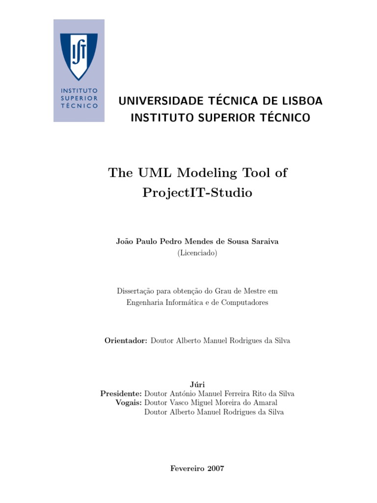 This MSc dissertation is organized around seven chapters and three appendices, whose contents are described in the next paragraphs. Chapter 1 Introduction. This chapter provides a brief overview of the ProjectIT research program, the ProjectIT approach and the prototype tool that supports it: ProjectIT-Studio. Moreover, the context and main objectives of this thesis are also described. Chapter 2 State of the Art. This chapter describes the concepts, techniques, tools, and frameworks that were analyzed in the context of this work. This analysis is particularly centered around: (1) MDE, (2) existing UML modeling tools and their features, and (3) technological frameworks that were either used in this work, or provided some fundamental ideas about what would be the most important factors to consider during the development of ProjectIT-Studio/UMLModeler. Chapter 3 ProjectIT-Studio Context. This chapter presents ProjectIT-Studio in greater detail, namely its high-level component architecture. Additionally, the various individual plugins that constitute ProjectIT-Studio are also presented, although not in great detail (since they were developed in parallel with this work). Chapter 4 The UML Modeling Plugin in ProjectIT-Studio. This chapter presents a thorough description of the ProjectIT-Studio/UMLModeler modeling plugin. The various internal components of the plugin are presented, as well as the technological and architectural decisions that were taken during the course of its development. Chapter 5 Supporting the XIS2 UML Prole. This chapter describes how the XIS2 prole was dened in ProjectIT-Studio/UMLModeler, as a way to validate the plugin as an eective way to specify and apply UML proles. Chapter 6 Conclusions and Future Work. The conclusions drawn from all the developed work are presented, as well as the future work that should be performed in order to signicantly enhance its performance and its user-interaction experience. Bibliography. Lists the bibliographical references that were found relevant either for research purposes or for the development of the modeling plugin itself.