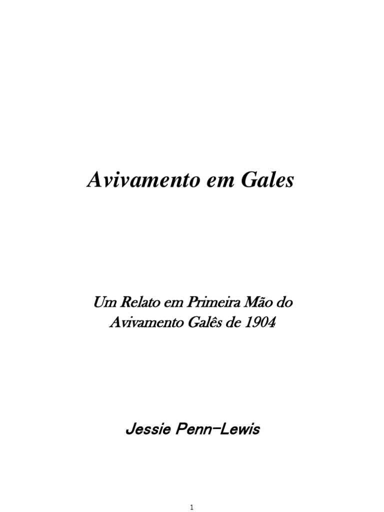 Introduo............................................................................8 Pelo Dr. Cynddylan Jones Captulo 1...........................................................................14 O Primeiro Pentecostes em Jerusalm e a Profecia de Joel O Movimento de Orao Os Crculos de Orao em 1902- A Pregao da Cruz Renovada. Captulo 2...........................................................................21 O Principado de Gales O Profeta do Avivamento A ltima Mensagem dele em Gales em 1903 A Primeira Conveno de Llandrindod em Agosto de 1903. Captulo 3...........................................................................27 O Manancial de Vida em New Quay em Fevereiro de 1904 A Segunda Conveno de Llandrindod em Agosto de 1904 Uma Reunio de Orao a Meia-Noite O Fluir do Rio no Outono. Captulo 4...........................................................................33 New Quay em Setembro de 1904 A Conveno de Blaenanerch O Batismo com o Esprito de Evan Roberts Loughor em Novembro de 1904 A Tsunami e o Seu Resultado.
