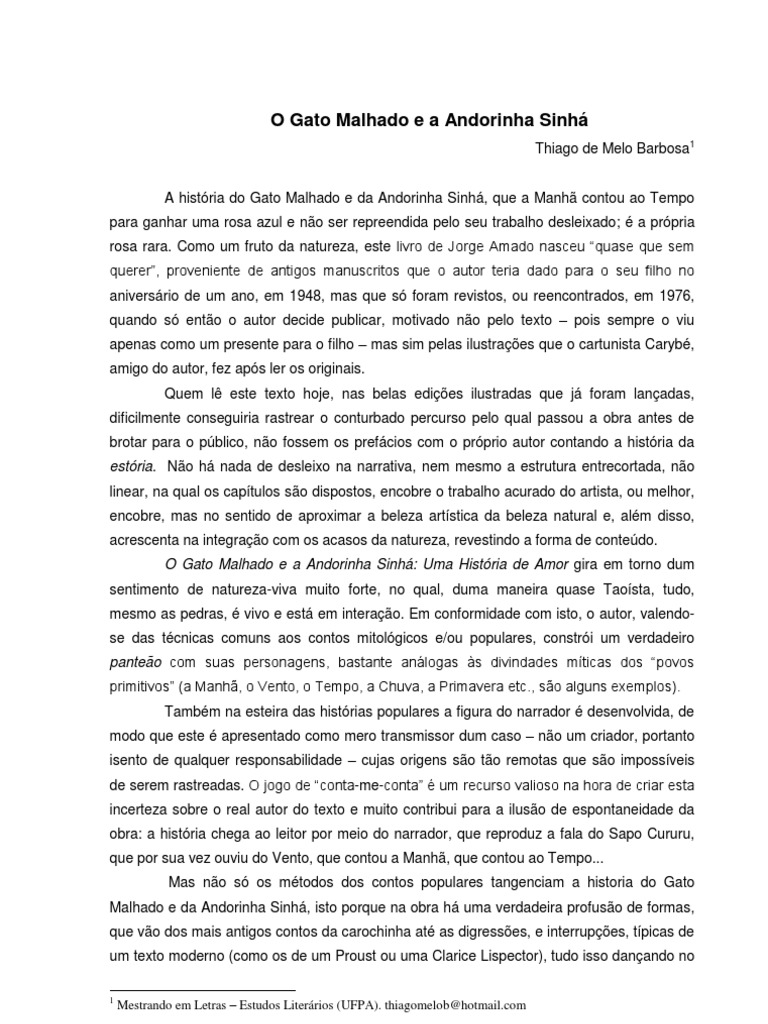 A histria do Gato Malhado e da Andorinha Sinh, que a Manh contou ao Tempo para ganhar uma rosa azul e no ser repreendida pelo seu trabalho desleixado; a prpria rosa rara. Como um fruto da natureza, este livro de Jorge Amado nasceu quase que sem querer, proveniente de antigos manuscritos que o autor teria dado para o seu filho no aniversrio de um ano, em 1948, mas que s foram revistos, ou reencontrados, em 1976, quando s ento o autor decide publicar, motivado no pelo texto pois sempre o viu apenas como um presente para o filho mas sim pelas ilustraes que o cartunista Caryb, amigo do autor, fez aps ler os originais. Quem l este texto hoje, nas belas edies ilustradas que j foram lanadas, dificilmente conseguiria rastrear o conturbado percurso pelo qual passou a obra antes de brotar para o pblico, no fossem os prefcios com o prprio autor contando a histria da estria. No h nada de desleixo na narrativa, nem mesmo a estrutura entrecortada, no linear, na qual os captulos so dispostos, encobre o trabalho acurado do artista, ou melhor, encobre, mas no sentido de aproximar a beleza artstica da beleza natural e, alm disso, acrescenta na integrao com os acasos da natureza, revestindo a forma de contedo. O Gato Malhado e a Andorinha Sinh: Uma Histria de Amor gira em torno dum sentimento de natureza-viva muito forte, no qual, duma maneira quase Taosta, tudo, mesmo as pedras, vivo e est em interao. Em conformidade com isto, o autor, valendose das tcnicas comuns aos contos mitolgicos e/ou populares, constri um verdadeiro panteo com suas personagens, bastante anlogas s divindades mticas dos povos primitivos (a Manh, o Vento, o Tempo, a Chuva, a Primavera etc., so alguns exemplos). Tambm na esteira das histrias populares a figura do narrador desenvolvida, de modo que este apresentado como mero transmissor dum caso no um criador, portanto isento de qualquer responsabilidade cujas origens so to remotas que so impossveis de serem rastreadas. O jogo de conta-me-conta um recurso valioso na hora de criar esta incerteza sobre o real autor do texto e muito contribui para a iluso de espontaneidade da obra: a histria chega ao leitor por meio do narrador, que reproduz a fala do Sapo Cururu, que por sua vez ouviu do Vento, que contou a Manh, que contou ao Tempo... Mas no s os mtodos dos contos populares tangenciam a historia do Gato Malhado e da Andorinha Sinh, isto porque na obra h uma verdadeira profuso de formas, que vo dos mais antigos contos da carochinha at as digresses, e interrupes, tpicas de um texto moderno (como os de um Proust ou uma Clarice Lispector), tudo isso danando no