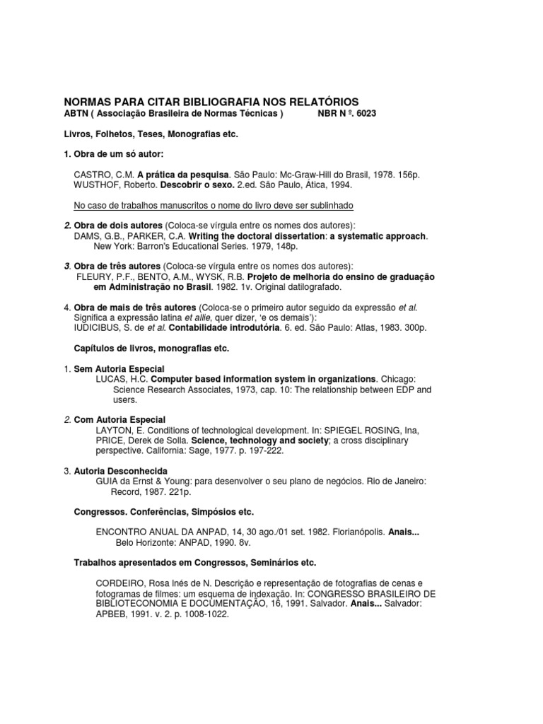 ABTN ( Associao Brasileira de Normas Tcnicas ) Livros, Folhetos, Teses, Monografias etc. 1. Obra de um s autor: CASTRO, C.M. A prtica da pesquisa. So Paulo: Mc-Graw-Hill do Brasil, 1978. 156p. WUSTHOF, Roberto. Descobrir o sexo. 2.ed. So Paulo, tica, 1994. No caso de trabalhos manuscritos o nome do livro deve ser sublinhado 2. Obra de dois autores (Coloca-se vrgula entre os nomes dos autores): DAMS, G.B., PARKER, C.A. Writing the doctoral dissertation: a systematic approach. New York: Barron's Educational Series. 1979, 148p. 3. Obra de trs autores (Coloca-se vrgula entre os nomes dos autores): FLEURY, P.F., BENTO, A.M., WYSK, R.B. Projeto de melhoria do ensino de graduao em Administrao no Brasil. 1982. 1v. Original datilografado. 4. Obra de mais de trs autores (Coloca-se o primeiro autor seguido da expresso et al. Significa a expresso latina et allie, quer dizer, e os demais): IUDICIBUS, S. de et al. Contabilidade introdutria. 6. ed. So Paulo: Atlas, 1983. 300p. Captulos de livros, monografias etc. 1. Sem Autoria Especial LUCAS, H.C. Computer based information system in organizations. Chicago: Science Research Associates, 1973, cap. 10: The relationship between EDP and users. 2. Com Autoria Especial LAYTON, E. Conditions of technological development. In: SPIEGEL ROSING, Ina, PRICE, Derek de Solla. Science, technology and society; a cross disciplinary perspective. California: Sage, 1977. p. 197-222. 3. Autoria Desconhecida GUIA da Ernst & Young: para desenvolver o seu plano de negcios. Rio de Janeiro: Record, 1987. 221p. Congressos. Conferncias, Simpsios etc. ENCONTRO ANUAL DA ANPAD, 14, 30 ago./01 set. 1982. Florianpolis. Anais... Belo Horizonte: ANPAD, 1990. 8v. Trabalhos apresentados em Congressos, Seminrios etc. CORDEIRO, Rosa lns de N. Descrio e representao de fotografias de cenas e fotogramas de filmes: um esquema de indexao. In: CONGRESSO BRASILEIRO DE BIBLIOTECONOMIA E DOCUMENTAO, 16, 1991. Salvador. Anais... Salvador: APBEB, 1991. v. 2. p. 1008-1022. NBR N . 6023