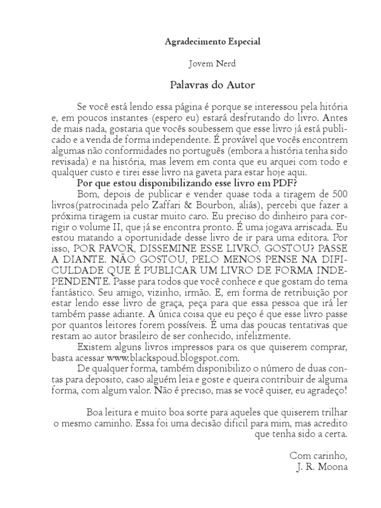 Se voc est lendo essa pgina porque se interessou pela hitria e, em poucos instantes (espero eu) estar desfrutando do livro. Antes de mais nada, gostaria que vocs soubessem que esse livro j est publi cado e a venda de forma independente. provvel que vocs encontrem algumas no conformidades no portugus (embora a histria tenha sido revisada) e na histria, mas levem em conta que eu arquei com todo e qualquer custo e tirei esse livro na gaveta para estar hoje aqui. Por que estou disponibilizando esse livro em PDF? Bom, depois de publicar e vender quase toda a tiragem de 500 livros(patrocinada pelo Zaffari & Bourbon, alis), percebi que fazer a prxima tiragem ia custar muito caro. Eu preciso do dinheiro para cor rigir o volume II, que j se encontra pronto. uma jogava arriscada. Eu estou matando a oportunidade desse livro de ir para uma editora. Por isso, POR FAVOR, DISSEMINE ESSE LIVRO. GOSTOU? PASSE A DIANTE. NO GOSTOU, PELO MENOS PENSE NA DIFI CULDADE QUE PUBLICAR UM LIVRO DE FORMA INDE PENDENTE. Passe para todos que voc conhece e que gostam do tema fantstico. Seu amigo, vizinho, irmo. E, em forma de retribuio por estar lendo esse livro de graa, pea para que essa pessoa que ir ler tambm passe adiante. A nica coisa que eu peo que esse livro passe por quantos leitores forem possveis. uma das poucas tentativas que restam ao autor brasileiro de ser conhecido, infelizmente. Existem alguns livros impressos para os que quiserem comprar, basta acessar www.blackspoud.blogspot.com. De qualquer forma, tambm disponibilizo o nmero de duas con tas para deposito, caso algum leia e goste e queira contribuir de alguma forma, com algum valor. No preciso, mas se voc quiser, eu agradeo! Boa leitura e muito boa sorte para aqueles que quiserem trilhar o mesmo caminho. Essa foi uma deciso dificil para mim, mas acredito que tenha sido a certa. Com carinho, J. R. Moona