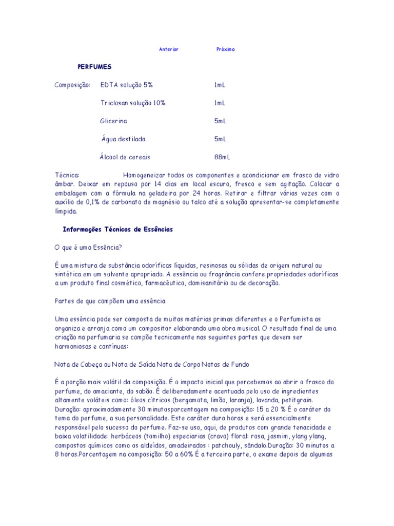 Tcnica: Homogeneizar todos os componentes e acondicionar em frasco de vidro mbar. Deixar em repouso por 14 dias em local escuro, fresco e sem agitao. Colocar a embalagem com a frmula na geladeira por 24 horas. Retirar e filtrar vrias vezes com o auxlio de 0,1% de carbonato de magnsio ou talco at a soluo apresentar-se completamente lmpida. Informaes Tcnicas de Essncias O que uma Essncia? uma mistura de substncia odorficas lquidas, resinosas ou slidas de origem natural ou sinttica em um solvente apropriado. A essncia ou fragrncia confere propriedades odorficas a um produto final cosmtico, farmacutico, domisanitrio ou de decorao. Partes de que compem uma essncia Uma essncia pode ser composta de muitas matrias primas diferentes e o Perfumista as organiza e arranja como um compositor elaborando uma obra musical. O resultado final de uma criao na perfumaria se compe tecnicamente nas seguintes partes que devem ser harmoniosas e contnuas: Nota de Cabea ou Nota de Sada Nota de Corpo Notas de Fundo a poro mais voltil da composio. o impacto inicial que percebemos ao abrir o frasco do perfume, do amaciante, do sabo. deliberadamente acentuada pelo uso de ingredientes altamente volteis como: leos ctricos (bergamota, limo, laranja), lavanda, petitgrain. Durao: aproximadamente 30 minutosporcentagem na composio: 15 a 20 % o carter do tema do perfume, a sua personalidade. Este carter dura horas e ser essencialmente responsvel pelo sucesso do perfume. Faz-se uso, aqui, de produtos com grande tenacidade e baixa volatilidade: herbceos (tomilho) especiarias (cravo) floral: rosa, jasmim, ylang ylang, compostos qumicos como os aldedos, amadeirados : patchouly, sndalo.Durao: 30 minutos a 8 horas.Porcentagem na composio: 50 a 60% a terceira parte, o exame depois de algumas