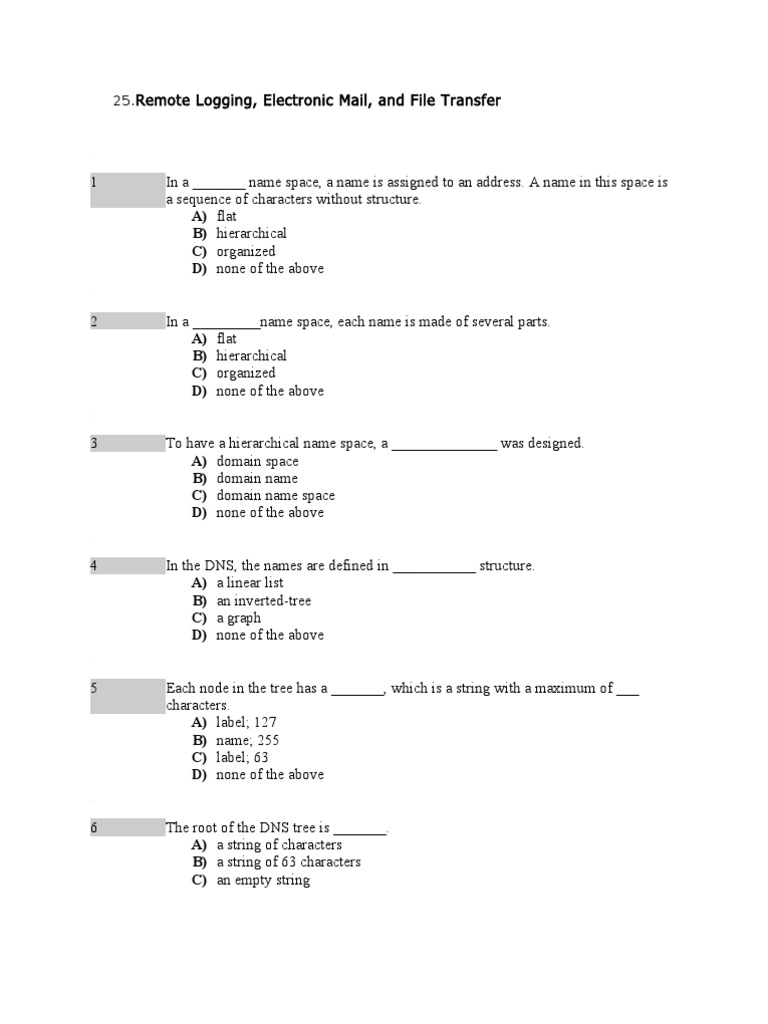 In a _______ name space, a name is assigned to an address. A name in this space is a sequence of characters without structure. A) flat B) hierarchical C) organized D) none of the above In a _________name space, each name is made of several parts. A) flat B) hierarchical C) organized D) none of the above To have a hierarchical name space, a ______________ was designed. A) domain space B) domain name C) domain name space D) none of the above In the DNS, the names are defined in ___________ structure. A) a linear list B) an inverted-tree C) a graph D) none of the above Each node in the tree has a _______, which is a string with a maximum of ___ characters. A) label; 127 B) name; 255 C) label; 63 D) none of the above The root of the DNS tree is _______. A) a string of characters B) a string of 63 characters C) an empty string