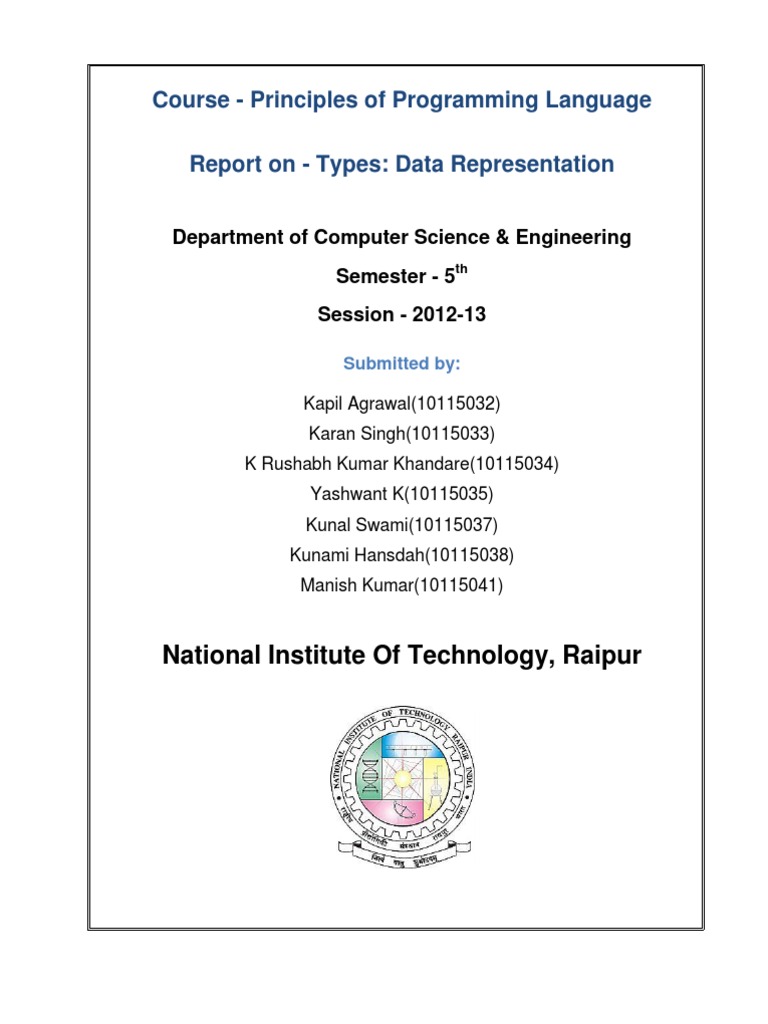 This report is based on the chapter Types: Data Representation of the subject Principles of Programming Language which deals with data in imperative languages. The imperative languages are separately from functional languages because the emphasis in imperative language is on data structures with assignable components; i.e. components can hold individual values. The size and layout of data structures tends to be fixed at compile time in this language, before a program is run. The various sections described here provides with the information regarding data structures that grow and shrink are typically implemented using fixed-size cells and pointers. Allocation and de-allocation in imperative language must be done explicitly. Further it introduces with the Basic Types ,integers and reals, programming styles regarding characters and type conversion, arrays and its types, layout, bounds (static and dynamic) ,storage. Some description on the working with records, fields, their specification and operations on them and lot more about pointers , sets, strings and error and type checking. Hope this work of ours would help out in better understanding of students and helping them to cope up with the topic of the subject.