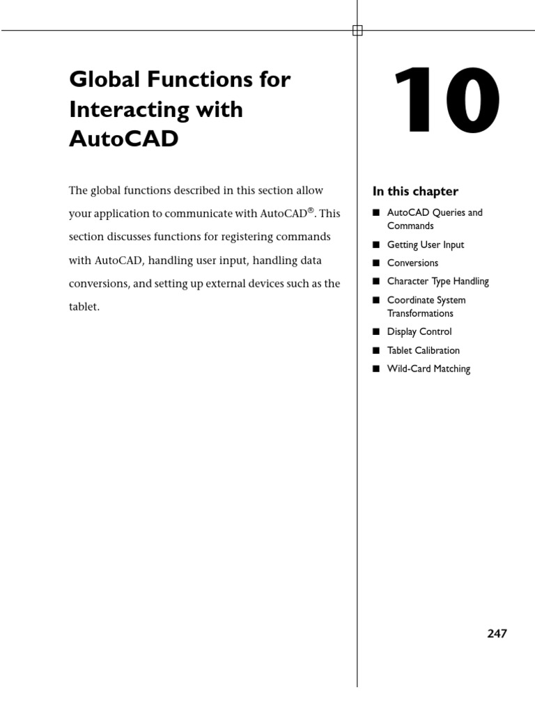 The global functions described in this section allow your application to communicate with AutoCAD. This section discusses functions for registering commands with AutoCAD, handling user input, handling data conversions, and setting up external devices such as the tablet.