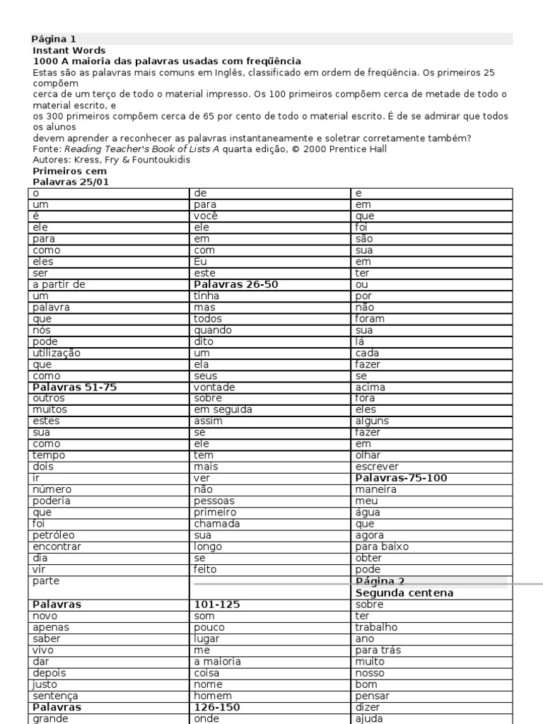 classificado em ordem de freqncia. Os primeiros 25 compem cerca de um tero de todo o material impresso. Os 100 primeiros compem cerca de metade de todo o material escrito, e os 300 primeiros compem cerca de 65 por cento de todo o material escrito. de se admirar que todos os alunos devem aprender a reconhecer as palavras instantaneamente e soletrar corretamente tambm? Fonte: Reading Teacher's Book of Lists A quarta edio, 2000 Prentice Hall Autores: Kress, Fry & Fountoukidis Primeiros cem Palavras 25/01