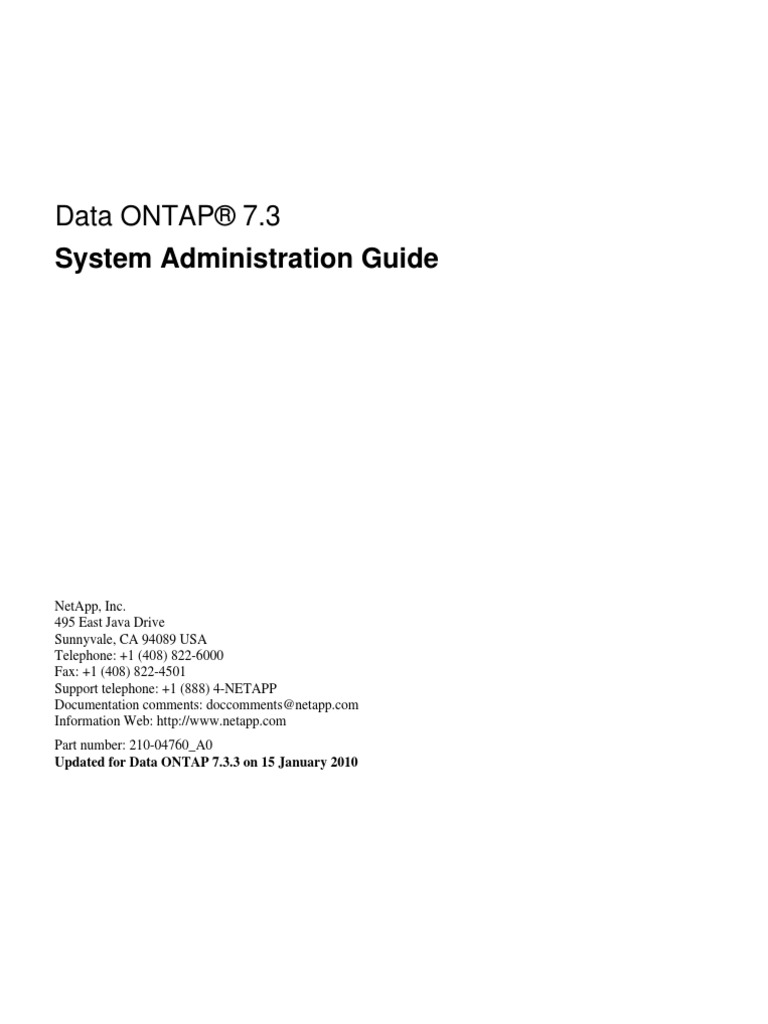NetApp, Inc. 495 East Java Drive Sunnyvale, CA 94089 USA Telephone: +1 (408) 822-6000 Fax: +1 (408) 822-4501 Support telephone: +1 (888) 4-NETAPP Documentation comments: doccomments@netapp.com Information Web: http://www.netapp.com Part number: 210-04760_A0 Updated for Data ONTAP 7.3.3 on 15 January 2010