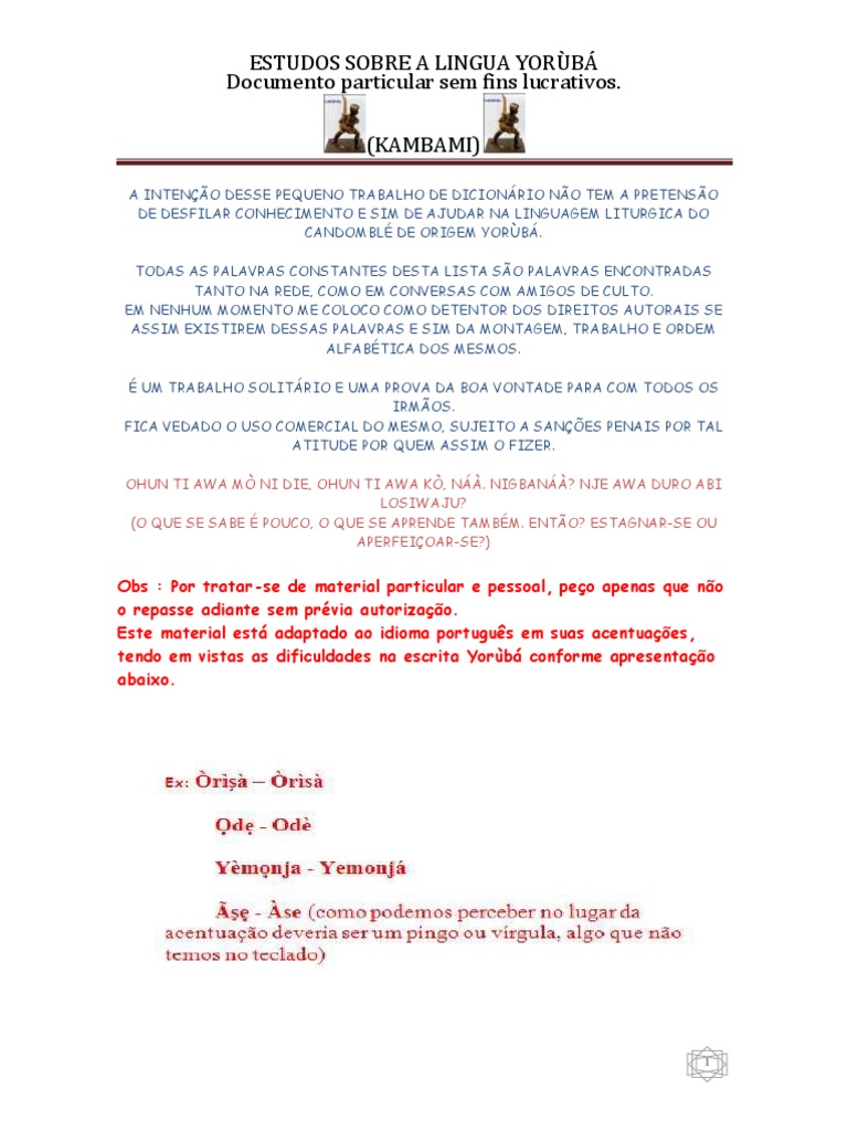 ESTUDOS SOBRE A LINGUA YORB Documento particular sem fins lucrativos. (KAMBAMI)
