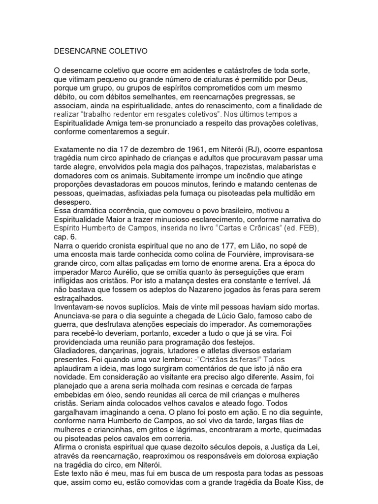 de criaturas permitido por Deus, porque um grupo, ou grupos de espritos comprometidos com um mesmo dbito, ou com dbitos semelhantes, em reencarnaes pregressas, se associam, ainda na espiritualidade, antes do renascimento, com a finalidade de realizar trabalho redentor em resgates coletivos. Nos ltimos tempos a Espiritualidade Amiga tem-se pronunciado a respeito das provaes coletivas, conforme comentaremos a seguir. Exatamente no dia 17 de dezembro de 1961, em Niteri (RJ), ocorre espantosa tragdia num circo apinhado de crianas e adultos que procuravam passar uma tarde alegre, envolvidos pela magia dos palhaos, trapezistas, malabaristas e domadores com os animais. Subitamente irrompe um incndio que atinge propores devastadoras em poucos minutos, ferindo e matando centenas de pessoas, queimadas, asfixiadas pela fumaa ou pisoteadas pela multido em desespero. Essa dramtica ocorrncia, que comoveu o povo brasileiro, motivou a Espiritualidade Maior a trazer minucioso esclarecimento, conforme narrativa do Esprito Humberto de Campos, inserida no livro Cartas e Crnicas (ed. FEB), cap. 6. Narra o querido cronista espiritual que no ano de 177, em Lio, no sop de uma encosta mais tarde conhecida como colina de Fourvire, improvisara-se grande circo, com altas paliadas em torno de enorme arena. Era a poca do imperador Marco Aurlio, que se omitia quanto s perseguies que eram infligidas aos cristos. Por isto a matana destes era constante e terrvel. J no bastava que fossem os adeptos do Nazareno jogados s feras para serem estraalhados. Inventavam-se novos suplcios. Mais de vinte mil pessoas haviam sido mortas. Anunciava-se para o dia seguinte a chegada de Lcio Galo, famoso cabo de guerra, que desfrutava atenes especiais do imperador. As comemoraes para receb-lo deveriam, portanto, exceder a tudo o que j se vira. Foi providenciada uma reunio para programao dos festejos. Gladiadores, danarinas, jograis, lutadores e atletas diversos estariam presentes. Foi quando uma voz lembrou: -Cristos s feras! Todos aplaudiram a ideia, mas logo surgiram comentrios de que isto j no era novidade. Em considerao ao visitante era preciso algo diferente. Assim, foi planejado que a arena seria molhada com resinas e cercada de farpas embebidas em leo, sendo reunidas ali cerca de mil crianas e mulheres crists. Seriam ainda colocados velhos cavalos e ateado fogo. Todos gargalhavam imaginando a cena. O plano foi posto em ao. E no dia seguinte, conforme narra Humberto de Campos, ao sol vivo da tarde, largas filas de mulheres e criancinhas, em gritos e lgrimas, encontraram a morte, queimadas ou pisoteadas pelos cavalos em correria. Afirma o cronista espiritual que quase dezoito sculos depois, a Justia da Lei, atravs da reencarnao, reaproximou os responsveis em dolorosa expiao na tragdia do circo, em Niteri. Este texto no meu, mas fui em busca de um resposta para todas as pessoas que, assim como eu, esto comovidas com a grande tragdia da Boate Kiss, de