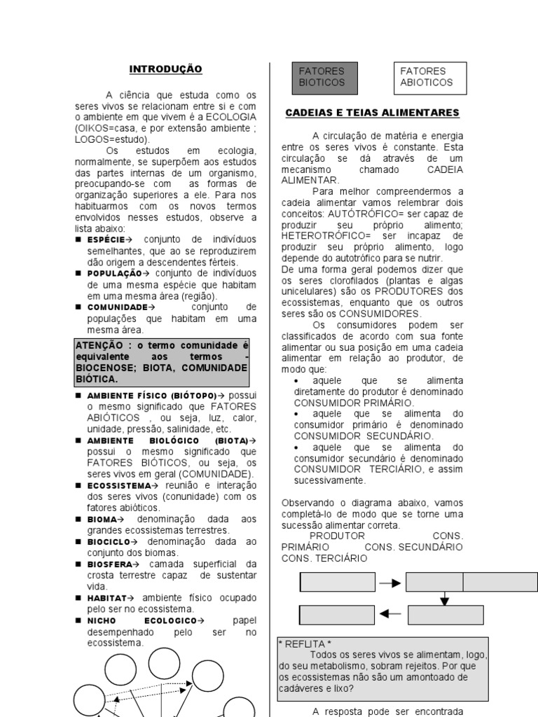 , e por extenso ambiente ; LOGOS=estudo). Os estudos em ecologia, normalmente, se superpem aos estudos das partes internas de um organismo, preocupando-se com as formas de organizao superiores a ele. Para nos habituarmos com os novos termos envolvidos nesses estudos, observe a lista abaixo: ESPCIE conjunto de indivduos semelhantes, que ao se reproduzirem do origem a descendentes frteis. POPULAO conjunto de indivduos de uma mesma espcie que habitam em uma mesma rea (regio). COMUNIDADE conjunto de populaes que habitam em uma mesma rea. ATENO : o termo comunidade equivalente aos termos BIOCENOSE; BIOTA, COMUNIDADE BITICA.