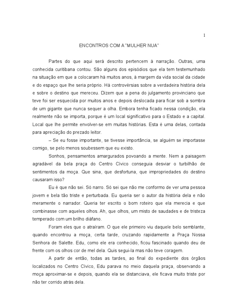 Voc no real, como posso conversar com uma esttua. Real ou no, e da? Eu tambm nem devia estar aqui, no devia ser a tal da Mulher Nua. Eu podia estar em outro lugar. Alis, estive jogada por quase duas dcadas nos fundos do Iguau. No sei por que no me colocaram num dos jardins l perto. Mas algum se importa? Quem se incomoda com o destino que me deram? Puta merda, era s o que me faltava, ser analista de esttua! Voc no analista de nada, meu bem! S queria quebrar um pouco o gelo. Parece que deu certo. Ok! Vou levar com bom humor, afinal sou um perdido mesmo, que anda correndo atrs de cabelos e perfume de rosas, leva cantada de velhinha estranha e depois bate papo com pedra. Perdido voc vai ficar quando se apaixonar de vez pela moa. Como voc sabe dela? Conhece ela? Claro, eu vi tudo daqui, o bobo correndo atrs da bela fera. Ah, ah, ah! A risada da esttua ecoou pela praa, mas foi abafada pelos barulhos dos carros e de buzinas. Fera por que? Ela me pareceu to doce e suave, triste, certo. porque no a conhece como eu. s vezes ela vem aqui, neste lugar onde est. Senta a perdida em amarguras. Eu tento falar com ela mas no tem jeito, no me ouve. Os pensamentos dela ficam to densos que eu me encolho nesta pedra dura na qual me escravizaram. Mas escuto tudo o que ela pensa. Vejo que uma alma boa, embora muito perturbada. E que pensamentos so esses? Voc acha que eu vou te contar? So secretos, no tenho permisso para falar deles, mas alguns so perturbadores. E o que pode ser perturbador pra uma pedra? Pare de me chamar assim! Eu posso ter um nome, t? E qual seria? ... Ah, sei l que nome tenho, alm desse ridculo apelido pelo qual me chamam. Voc no gosta de ser chamada de Mulher Nua?