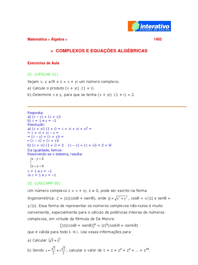 02. (UNICAMP 05) Um nmero complexo z = x + iy, z 0, pode ser escrito na forma trigonomtrica: z = |z|(cos + isen), onde z = x 2 + y 2 , cos = x/|z| e sen = y/|z|. Essa forma de representar os nmeros complexos no-nulos muito conveniente, especialmente para o clculo de potncias inteiras de nmeros complexos, em virtude da frmula de De Moivre: [|z|(cos + isen)]k = |z|k(cosk + isenk) que vlida para todo k Z. Use essas informaes para: a) Calcular