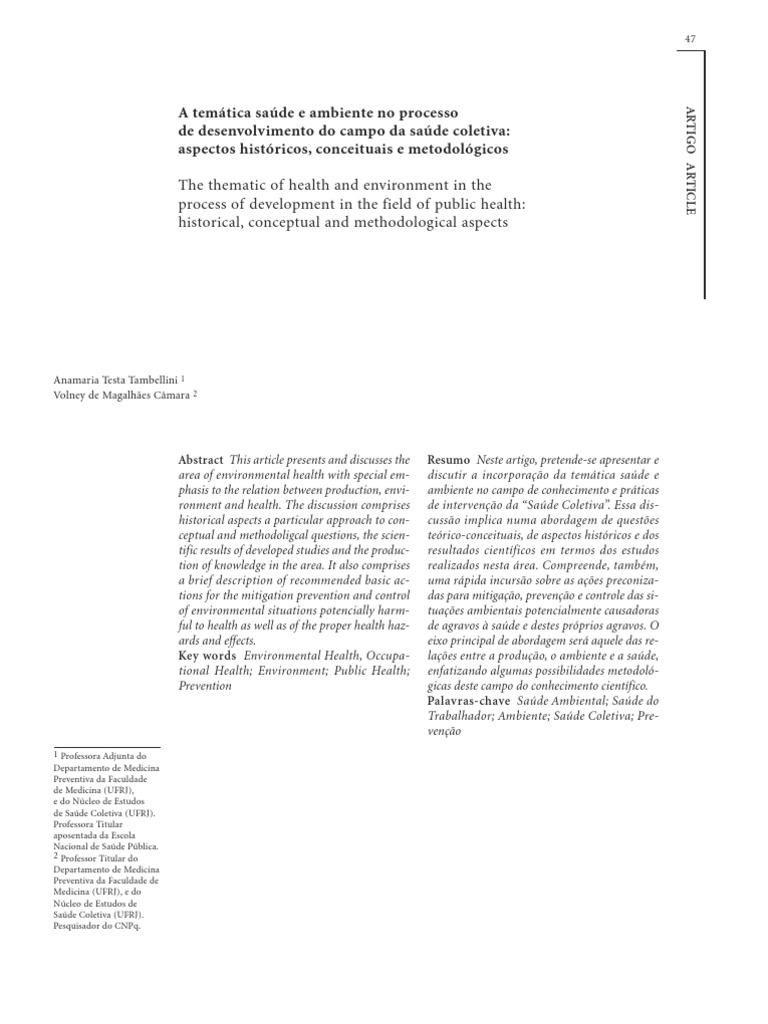 Tambellini AT 1995. A Relao Produo/Ambiente/Sade Vista do ngulo da Sade Coletiva . Universidade Federal do Rio de Janeiro, Rio de Janeiro, mimeo. Tambellini AT 1996a. Notas provisrias sobre uma tentativa de pensar a sade em suas relaes com o ambiente. Por uma Rede de Trabalho, Sade e Modos de Vida no Brasil Rio de Janeiro, Fiocruz 2(1-2):12-16. Tambellini AT 1996b. Texto Preparatrio para a Discusso Terico-conceitual da rea Produo/Ambiente/Sade do Projeto de Mestrado em Sade Coletiva. Universidade Federal do Rio de Janeiro, UFRJ, Rio de Janeiro, mimeo. Trap AZ 1997. Effects of Exposure to Organochlorine Micropolutants on Humans . International Workshop on Organic Micropollutants in the Environment. Instituto de Biofsica, Universidade Federal do Rio de Janeiro, Rio de Janeiro. Trindade DM 1997. Contribuio do Ambulatrio de Doenas do Trabalho Oficina de Sade do Trabalhador . Relatrio do Ambulatrio de Doenas do Trabalho, Universidade Federal do Rio Grande do Sul, Porto Alegre, mimeo. UNITRABALHO 1997 . Levantamento da Produo Acadmica. Contribuio para o Exerccio da Cidadania. Fundao UNITRABALHO, So Paulo, mimeo. WHO World Health Organization 1994. Major Poisoning from Environmental Chemicals . Environmental Occupational Epidemiology Series. Genebra.
