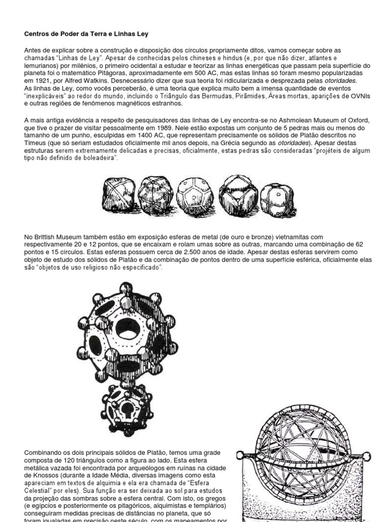 comear sobre as chamadas Linhas de Ley. Apesar de conhecidas pelos chineses e hindus (e, por que no dizer, atlantes e lemurianos) por milnios, o primeiro ocidental a estudar e teorizar as linhas energticas que passam pela superfcie do planeta foi o matemtico Pitgoras, aproximadamente em 500 AC, mas estas linhas s foram mesmo popularizadas em 1921, por Alfred Watkins. Desnecessrio dizer que sua teoria foi ridicularizada e desprezada pelas otoridades. As linhas de Ley, como vocs percebero, uma teoria que explica muito bem a imensa quantidade de eventos inexplicveis ao redor do mundo, incluindo o Tringulo das Bermudas, Pirmides, reas mortas, aparies d e OVNIs e outras regies de fenmenos magnticos estranhos. A mais antiga evidncia a respeito de pesquisadores das linhas de Ley encontra-se no Ashmolean Museum of Oxford, que tive o prazer de visitar pessoalmente em 1989. Nele esto expostas um conjunto de 5 pedras mais ou menos do tamanho de um punho, esculpidas em 1400 AC, que representam precisamente os slidos de Plato descritos no Timeus (que s seriam estudados oficialmente mil anos depois, na Grcia segundo as otoridades). Apesar destas estruturas serem extremamente delicadas e precisas, oficialmente, estas pedras so consideradas projteis de algum tipo no definido de boleadeira.
