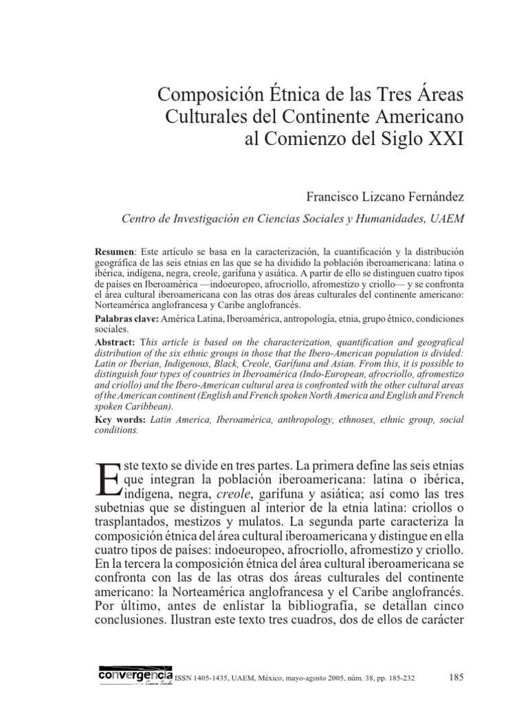pginas es compatible con la posibilidad (y el deseo) de que tales culturas sigan incidiendo, con lo mejor de ellas mismas, en la etnia latina y en las culturas nacionales correspondientes, bien introduciendo rasgos suyos en ellas (con las adaptaciones de rigor), bien contribuyendo al fortalecimiento de ciertos aspectos de lo occidental. Esto implica que de las culturas no occidentales, como de las occidentales, se puede esperar frutos mejores y peores. Aunque es frecuente, pensar lo contrario en gen eral est relacionado con puntos de vista etnocntricos y romnticos que descansan en las percepciones cmodas y simplistas tan queridas por maniqueos de toda laya. En el fondo, los defensores de la superioridad de lo premoderno frente a lo moderno suelen ser tan parciales y simplistas como los modernizadores a ultranza, que condenan a priori todo lo que no se ajusta a la modernidad. 5.De acuerdo con sus respectivas composiciones tnicas, los pases iberoamericanos se dividen en cuatro tipos: indoeuropeos, afrocriollos, afromestizos y criollos. En el primero sobresale lo espaol y lo indgena; en el segundo, lo ibrico y lo africano; en el tercero se conjugan las tres races constitutivas de Iberoamrica; y en el cuarto slo la latina es verdaderamente relevante en lo demogrfico. fralife@prodigy.net.mx F r a n c i s c o L i zc a n o F e r n n d e z . Doc tor en Estudi os Latinoamericanos por la UNAM, en los ltimos aos ha publicado diversos trabajos sobre el desarrollo socioeconmico y la evolucin tnica de Iberoamrica desde mediados del siglo XX. Recepcin: 03 de enero de 2005 Aprobacin: 16 de marzo de 2005