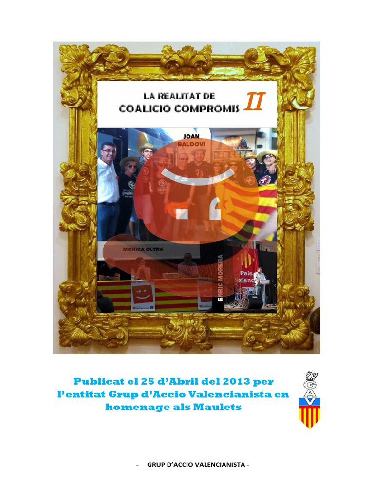 Hasta aqu esta segunda parte de la realidad de Compromis. Una coalicin que en realidad no es otra ms de las mltiples caras que el catalanismo poltico ha venido adoptando desde la misma transicin, en su intento de acceder a las instituciones valencianas para una vez en ellas poder desarrollar su proyecto pancatalanista con total impunidad. Da igual que les llamemos PNPV, UPV, BLOC o COMPROMIS. Es indiferente que el proyecto lo lidere F. de Paula Burguera, Pere Major, Monica Oltra o Enric Morera. Lo que no ha cambiado con el paso de los aos es su habilidad para esconder sus verdaderas intenciones detrs de un discurso pseudo progresistaecologista que pueda cuajar en ciertos sectores de la sociedad valenciana, a la que en muy contadas ocasiones se les permite entrever los autnticos fines que persiguen. Es por este motivo que desde el Grup dAccio Valencianista hemos credo necesario la realizacin de estos dos informes sobre la realidad de BLOC-COMPROMIS. Para sacar a la luz lo que los medios de comunicacin y el propio partido pretenden mantener en las sombras. Y es tambin por todo esto, por lo que probablemente este no sea el ltimo, ya que nuestra intencin es desenmascarar al principal partido catalanista de Valencia, hasta las ltimas consecuencias.