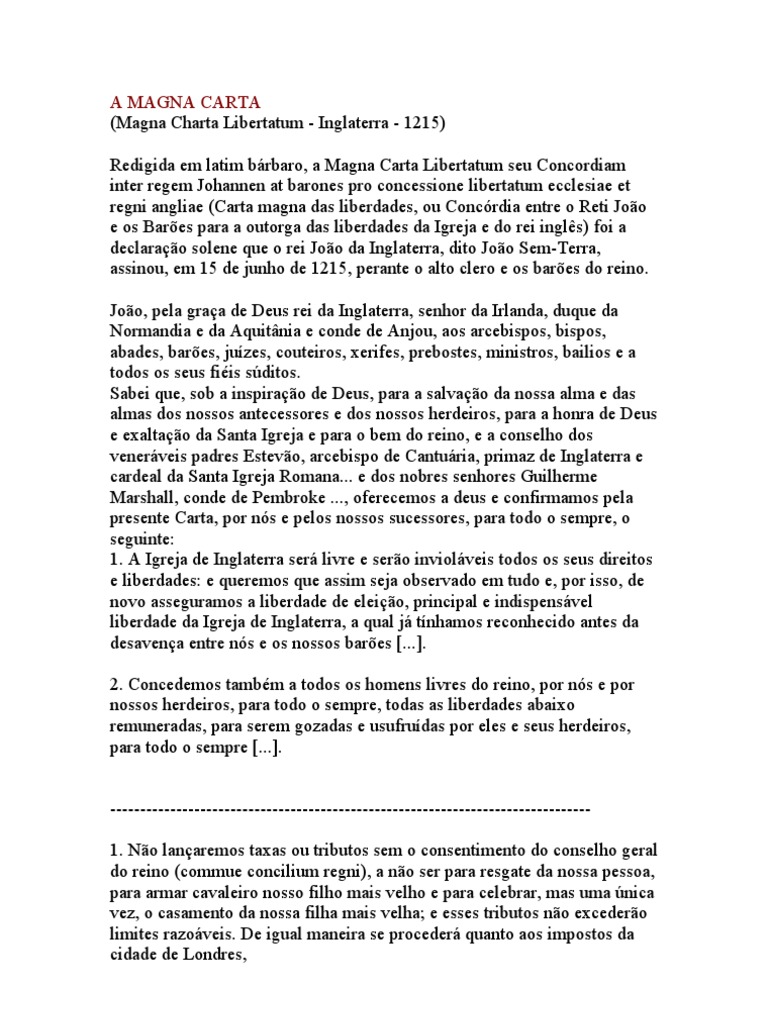 inter regem Johannen at barones pro concessione libertatum ecclesiae et regni angliae (Carta magna das liberdades, ou Concrdia entre o Reti Joo e os Bares para a outorga das liberdades da Igreja e do rei ingls) foi a declarao solene que o rei Joo da Inglaterra, dito Joo Sem-Terra, assinou, em 15 de junho de 1215, perante o alto clero e os bares do reino. Joo, pela graa de Deus rei da Inglaterra, senhor da Irlanda, duque da Normandia e da Aquitnia e conde de Anjou, aos arcebispos, bispos, abades, bares, juzes, couteiros, xerifes, prebostes, ministros, bailios e a todos os seus fiis sditos. Sabei que, sob a inspirao de Deus, para a salvao da nossa alma e das almas dos nossos antecessores e dos nossos herdeiros, para a honra de Deus e exaltao da Santa Igreja e para o bem do reino, e a conselho dos venerveis padres Estevo, arcebispo de Canturia, primaz de Inglaterra e cardeal da Santa Igreja Romana... e dos nobres senhores Guilherme Marshall, conde de Pembroke ..., oferecemos a deus e confirmamos pela presente Carta, por ns e pelos nossos sucessores, para todo o sempre, o seguinte: 1. A Igreja de Inglaterra ser livre e sero inviolveis todos os seus direitos e liberdades: e queremos que assim seja observado em tudo e, por isso, de novo asseguramos a liberdade de eleio, principal e indispensvel liberdade da Igreja de Inglaterra, a qual j tnhamos reconhecido antes da desavena entre ns e os nossos bares [...]. 2. Concedemos tambm a todos os homens livres do reino, por ns e por nossos herdeiros, para todo o sempre, todas as liberdades abaixo remuneradas, para serem gozadas e usufrudas por eles e seus herdeiros, para todo o sempre [...]. -------------------------------------------------------------------------------1. No lanaremos taxas ou tributos sem o consentimento do conselho geral do reino (commue concilium regni), a no ser para resgate da nossa pessoa, para armar cavaleiro nosso filho mais velho e para celebrar, mas uma nica vez, o casamento da nossa filha mais velha; e esses tributos no excedero limites razoveis. De igual maneira se proceder quanto aos impostos da cidade de Londres,