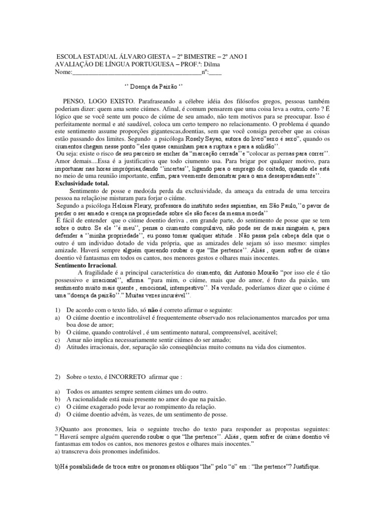 OF.: Dilma Nome:________________________________________n:____ Doena da Paixo PENSO, LOGO EXISTO. Parafraseando a clebre idia dos filsofos gregos, pessoas tambm poderiam dizer: quem ama sente cimes. Afinal, comum pensarem que uma coisa leva a outra, certo ? lgico que se voc sente um pouco de cime de seu amado, no tem motivos para se preocupar. Isso perfeitamente normal e at saudvel, coloca um certo tempero no relacionamento. O problema quando este sentimento assume propores gigantescas,doentias, sem que voc consiga perceber que as coisas esto passando dos limites. Segundo a psicloga Rosely Sayao, autora do livrosexo sexo, quando os ciumentos chegam nesse ponto eles quase caminham para a ruptura e para a solido. Ou seja: existe o risco de seu parceiro se encher da marcao cerradae colocar as pernas para correr. Amor demais....Essa a justificativa que todo ciumento usa. Para brigar por qualquer motivo, para importunar nas horas imprprias,dando incertas, ligando para o emprego do coitado, quando ele est no meio de uma reunio importante, enfim, para veemente demonstrar para o ama desesperadamente. Exclusividade total. Sentimento de posse e medo(da perda da exclusividade, da ameaa da entrada de uma terceira pessoa na relao)se misturam para forjar o cime. Segundo a psicloga Heloisa Fleury, professora do instituto sedes sapientiae, em So Paulo,o pavor de perder o ser amado e crena na propriedade sobre ele so faces da mesma moeda fcil de entender que o cime doentio deriva , em grande parte, do sentimento de posse que se tem sobre o outro. Se ele meu, pensa o ciumento compulsivo, no pode ser de mais ningum e, para defender a minha propriedade, eu posso tomar qualquer atitude . No passa pela cabea dela que o outro um individuo dotado de vida prpria, que as amizades dele sejam s isso mesmo: simples amizade. Haver sempre algum querendo roubar o que lhe pertence. Alis , quem sofrer de cime doentio v fantasmas em todos os cantos, nos menores gestos e olhares mais inocentes. Sentimento Irracional. A fragilidade a principal caracterstica do ciumento, diz Antonio Mouro por isso ele to possessivo e irracional, afirma. para mim, o cime, mais que do amor, fruto da paixo, um sentimento muito mais quente , emocional, intempestivo. Na v erdade, poderamos dizer que o cime uma doena da paixo. Muitas vezes incurvel. 1) De acordo com o texto lido, s no correto afirmar o seguinte: a) O cime doentio e incontrolvel frequentemente observado nos relacionamentos marcados por uma boa dose de amor; b) O cime, quando controlvel , um sentimento natural, compreensvel, aceitvel; c) Amar no implica necessariamente sentir cimes do ser amado; d) Atitudes irracionais, dor, separao so conseqncias muito comuns na vida dos ciumentos.