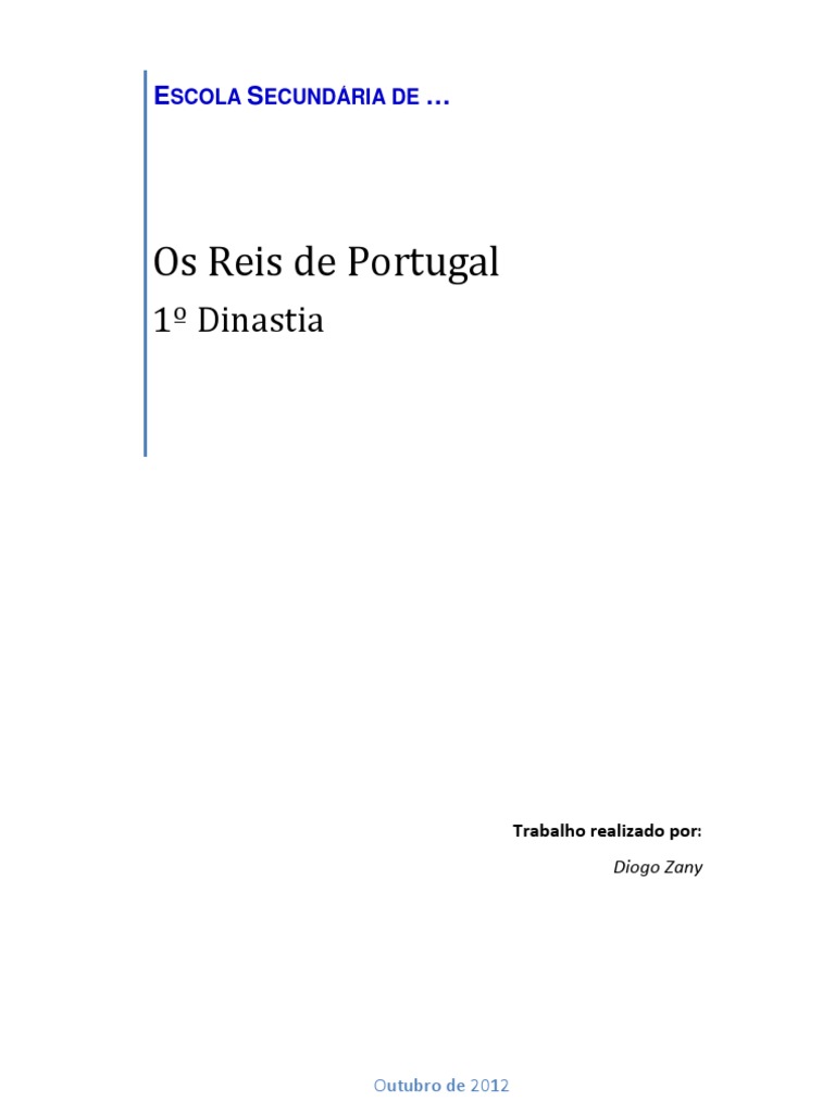 Neste trabalho realizei uma pesquisa do tema Os Reis de Portugal. Ao realizar a minha pesquisa recordei que em Portugal houve quatro Dinastias e que todos os reis tinham um cognome, que indicava a firmeza e retido de carcter, a amabilidade, a beleza ou feitos, etc.. Tal como sugerido pela professora (Dra. Teresa Graa) vou desenvolver um pouco mais os tpicos relativos aos reis da primeira dinastia, mas porque fiquei muito entusiasmado, optei por apresentar todos os reis das quatro dinastias.