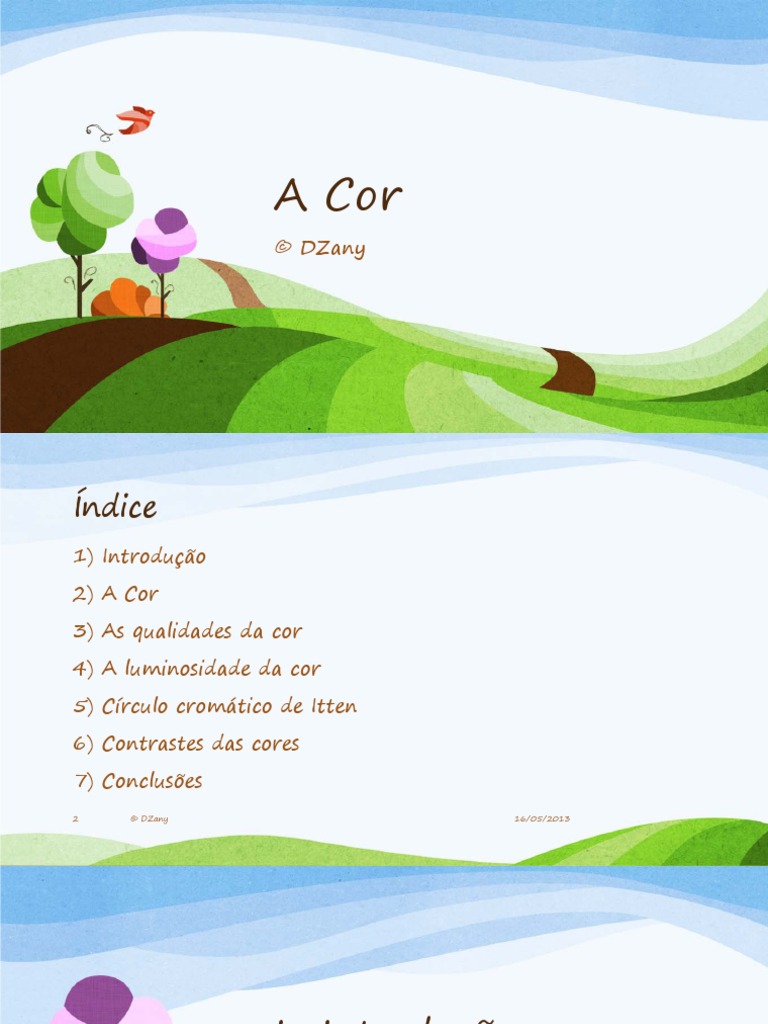 1) Introdução 2) A Cor 3) As qualidades da cor 4) A luminosidade da cor 5) Círculo cromático de Itten 6) Contrastes das cores 7) Conclusões