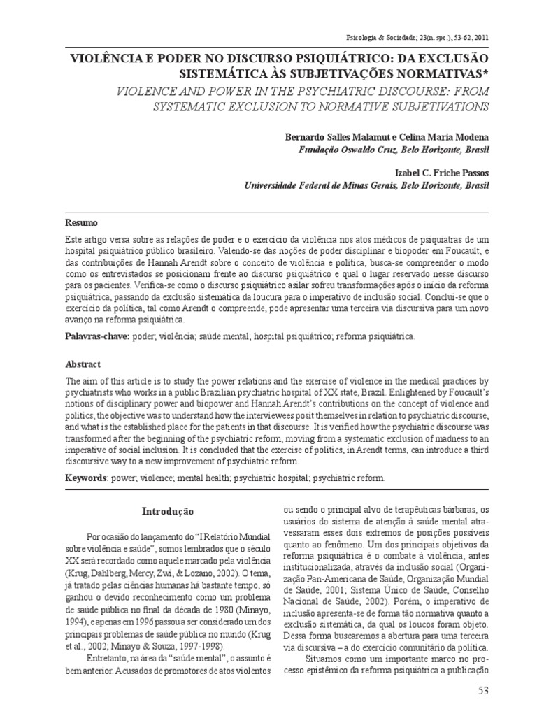 Malamut, B., Modena, C. M., & Passos, I. F. (2011). Violncia e poder no discurso psiquitrico: da excluso sistemtica s subjetivaes normativas. Psicologia & Sociedade, 23(n. spe.), 53-62.