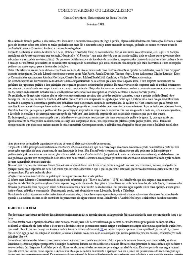 viver para a sua comunidade organizada em torno de uma s ideia substantiva de bem comum. Subjacente a estes princpios comunitaristas encontramos ticasSubstanciais, que determinam que uma teoria moral s se pode desenvolver a partir de uma concepo especfica do bem, ou mesmo, de uma hierarquia de bens. So ticasPerfeccionistas ao afirmarem que no podemos definir aquilo que politicamente justo sem invocar uma concepo substancial do bem, e Contextualistas (na justificao mais radicalmente comunitarista), ao defenderem que no podemos apontar uma concepo do bem sobre uma base natural e abstracta mas apenas por referncia aos valores substanciais veiculados pela tradio de uma comunidade histrica particular. No caso dos Liberais, encontramos ticas Procedimentaisque definem uma teoria moral fundada segundo normas procedimentais, formais, desligadas de qualquer concepo especfica do bem. So ticas que em vez de decidirem o que que h que fazer, dizem de que forma decidiremos correctamente o que devemos fazer. Por esta razo so Anti- Perfeccionistas ou Neutralistas na justificao de regras que orientem a vida pblica. O debate entre Liberais e Comunitaristas foi despoletado sobretudo pela "Teoria da Justia" (1971) de John Rawls, que deu origem a uma renovao espectacular da filosofia poltica anglo-saxnica. Apesar do grande nmero de objeces e comentrios em volta deste tema h, de certa forma, consenso entre filsofos polticos das duas "equipas", sobre os temas essenciais a tratar dentro desta discusso. Em primeiro lugar importa referir duas oposies nevrlgicas: justia e bem; indivduo e comunidade. Num segundo ponto, ser abordado o tema: Liberdade, Estado e Cidadania. No intuito de melhor apresentar a discusso liberais/comunitaristas, o trabalho a seguir apresentado, est estruturado sobre esses elementos fundamentais da querela e, alm disso, recorre-se do contributo do pensamento de alguns autores como, John Rawls e Alasdair MacIntyre, emblemtico das duas correntes.