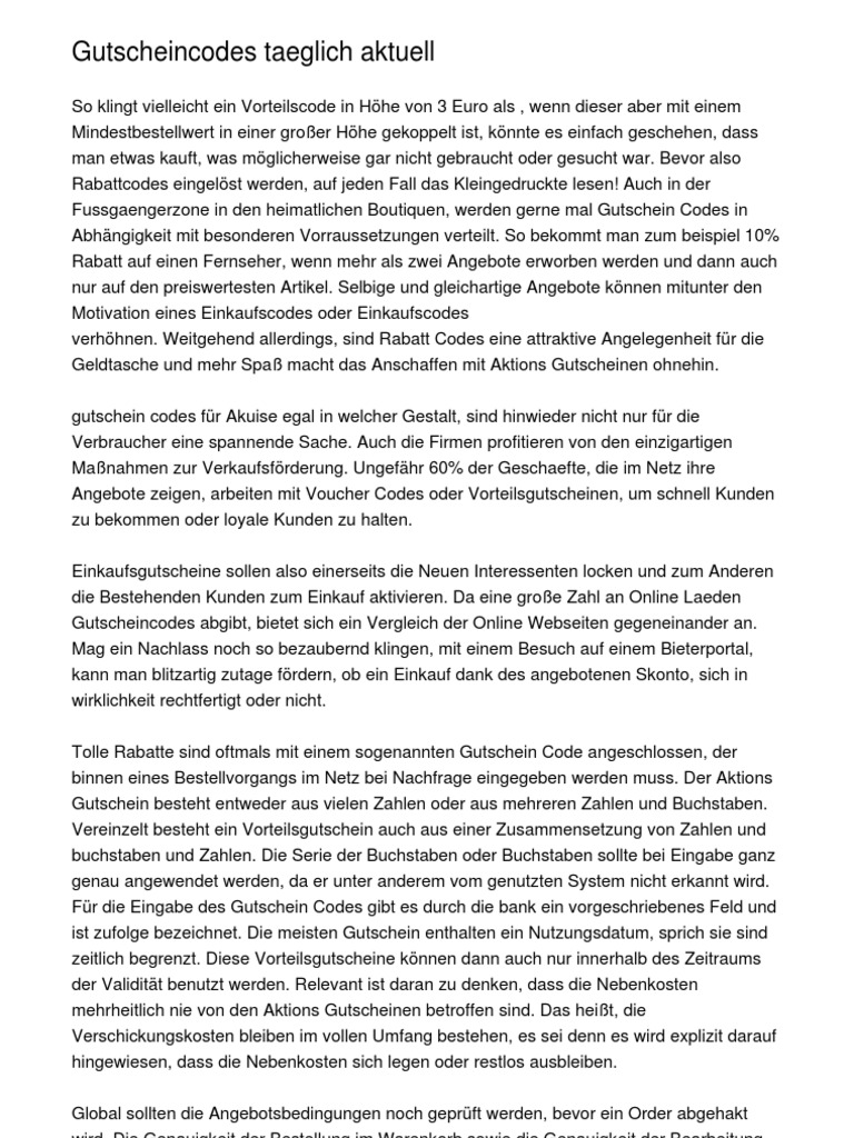 So klingt vielleicht ein Vorteilscode in Hhe von 3 Euro als , wenn dieser aber mit einem Mindestbestellwert in einer groer Hhe gekoppelt ist, knnte es einfach geschehen, dass man etwas kauft, was mglicherweise gar nicht gebraucht oder gesucht war. Bevor also Rabattcodes eingelst werden, auf jeden Fall das Kleingedruckte lesen! Auch in der Fussgaengerzone in den heimatlichen Boutiquen, werden gerne mal Gutschein Codes in Abhngigkeit mit besonderen Vorraussetzungen verteilt. So bekommt man zum beispiel 10% Rabatt auf einen Fernseher, wenn mehr als zwei Angebote erworben werden und dann auch nur auf den preiswertesten Artikel. Selbige und gleichartige Angebote knnen mitunter den Motivation eines Einkaufscodes oder Einkaufscodes verhhnen. Weitgehend allerdings, sind Rabatt Codes eine attraktive Angelegenheit fr die Geldtasche und mehr Spa macht das Anschaffen mit Aktions Gutscheinen ohnehin. gutschein codes fr Akuise egal in welcher Gestalt, sind hinwieder nicht nur fr die Verbraucher eine spannende Sache. Auch die Firmen profitieren von den einzigartigen Manahmen zur Verkaufsfrderung. Ungefhr 60% der Geschaefte, die im Netz ihre Angebote zeigen, arbeiten mit Voucher Codes oder Vorteilsgutscheinen, um schnell Kunden zu bekommen oder loyale Kunden zu halten. Einkaufsgutscheine sollen also einerseits die Neuen Interessenten locken und zum Anderen die Bestehenden Kunden zum Einkauf aktivieren. Da eine groe Zahl an Online Laeden Gutscheincodes abgibt, bietet sich ein Vergleich der Online Webseiten gegeneinander an. Mag ein Nachlass noch so bezaubernd klingen, mit einem Besuch auf einem Bieterportal, kann man blitzartig zutage frdern, ob ein Einkauf dank des angebotenen Skonto, sich in wirklichkeit rechtfertigt oder nicht. Tolle Rabatte sind oftmals mit einem sogenannten Gutschein Code angeschlossen, der binnen eines Bestellvorgangs im Netz bei Nachfrage eingegeben werden muss. Der Aktions Gutschein besteht entweder aus vielen Zahlen oder aus mehreren Zahlen und Buchstaben. Vereinzelt besteht ein Vorteilsgutschein auch aus einer Zusammensetzung von Zahlen und buchstaben und Zahlen. Die Serie der Buchstaben oder Buchstaben sollte bei Eingabe ganz genau angewendet werden, da er unter anderem vom genutzten System nicht erkannt wird. Fr die Eingabe des Gutschein Codes gibt es durch die bank ein vorgeschriebenes Feld und ist zufolge bezeichnet. Die meisten Gutschein enthalten ein Nutzungsdatum, sprich sie sind zeitlich begrenzt. Diese Vorteilsgutscheine knnen dann auch nur innerhalb des Zeitraums der Validitt benutzt werden. Relevant ist daran zu denken, dass die Nebenkosten mehrheitlich nie von den Aktions Gutscheinen betroffen sind. Das heit, die Verschickungskosten bleiben im vollen Umfang bestehen, es sei denn es wird explizit darauf hingewiesen, dass die Nebenkosten sich legen oder restlos ausbleiben. Global sollten die Angebotsbedingungen noch geprft werden, bevor ein Order abgehakt wird. Die Genauigkeit der Bestellung im Warenkorb sowie die Genauigkeit der Bearbeitung