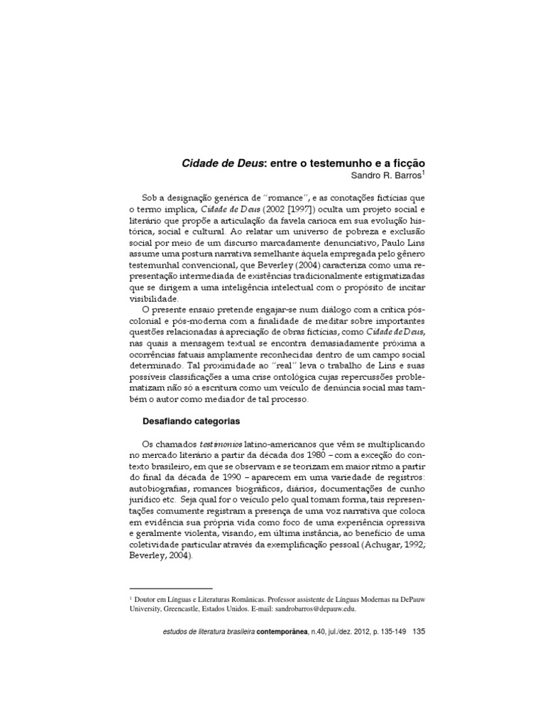 Cidade de Deus: entre o testemunho e a co Sandro R. Barros O presente artigo discute a problemtica em torno da separao epistemolgica entre o romance Cidade de Deus e seu autor, Paulo Lins, bem como as conotaes referentes a possveis leituras da obra no tangente ao seu valor-verdade. O estudo busca ainda analisar a recepo do texto de Lins no que convencionalmente veio chamar-se, dentro do contexto latino-americano, de testimonio. A anlise da obra de Lins sob a rubrica testemunhal nos permitir meditar sobre problemticas questes relacionadas a qualquer texto ctcio cujo contedo se faz demasiadamente prximo a eventos reconhecidamente fatuais, o que leva a obra literria e seus possveis rtulos a uma crise ontolgica cuja repercusso problematiza a literatura como um veculo de denncia social e o autor como o mediador de tal processo. Palavras-chave: Testemunho, co, narrativa brasileira contempornea, favelas, subalternidade, alteridade, Paulo Lins Cidade de Deus: between testimony and ction Sandro R. Barros The following article discusses the problematic epistemological separation between Paulo Linss novel and the authors identity as a construct that redirects the texts message in very specic ways. This construct phenomenon affects the novels ctional status on the account of its truth-value. In this sense, this study also analyses the reception of Lins text under what has been epistemologically termed in Latin American subaltern studies as testimonio. The analysis of Linss novel under the testimonial rubric allows for a meditation on questions related to any ctional text whose content stands too close to factually recognizable events,