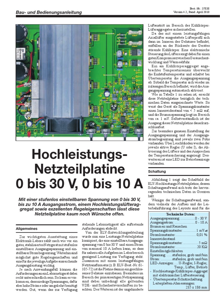 Luftaustritt im Bereich des KhlkrperLferaggregates sicherzustellen. Da das mit einem leistungsfhigen Axiallfter ausgestattete Lfterprofil sich dann im Inneren des Gehuses befindet, entfallen an der Rckseite des Gertes strende Khlkrper. Eine elektronische Steuerung des Lfters sorgt dabei fr einen guten Kompromiss zwischen Geruschentwicklung und Wrmeabfuhr. Ein am Khlkrperaggregat angebrachter Temperatursensor berwacht die Endstufentemperatur und schaltet bei bertemperatur die Ausgangsspannung ab. Sobald die Temperatur sich wieder im zulssigen Bereich befindet, wird die Ausgangsspannung automatisch aktiviert. Wie in Tabelle 1 zu sehen ist, erreicht diese Netzteilplatine bezglich der technischen Daten ausgezeichnete Werte. So weist das Gert als Spannungskonstanter einen Innenwiderstand von < 5 m auf, und die Brummspannung liegt im Bereich von ca. 1 mV. Selbstverstndlich ist der Ausgang dieser Netzteilplatine dauerkurzschlussfest. Zur besonders genauen Einstellung der Ausgangsspannung und der Ausgangsstrombegrenzung sind jeweils zwei Potis vorhanden. ber Leuchtdioden werden der jeweils aktive Regler (U oder I), die Aktivierung des Lfters und das Ansprechen der Temperatursicherung angezeigt. Desweiteren ist eine LED zur Betriebsanzeige vorhanden. Schaltung Abbildung 1 zeigt das Schaltbild der ELV-Hochleistungs-Netzteilplatine, dessen Schaltungsaufwand sich trotz der hervorragenden technischen Daten in Grenzen hlt. Weniger der Schaltungsaufwand, sondern vielmehr der Aufbau und die Leiterbahnfhrung des Layouts sind fr die Technische Daten: Ausgangsspannung:.................0 - 30 V Ausgangsstrom:.......................0 - 10 A Brummen und Rauschen Spannungskonstanter:............... 1 mVeff Stromkonstanter:. ...................... 0,01 % Innenwiderstand Spannungskonstanter:................. 5 m Stromkonstanter:. .......................20 K Einstellmglichkeiten Spannung:.......stufenlos, grob und fein Strom:.............stufenlos, grob und fein LED-Anzeigen:. .....U-Regler, I-Regler, Temp., Lfter, Betrieb - Hochleistungs-Khlkrper-Aggregat mit elektronsicher Lftersteuerung - bertemperatur-Schutzschaltung Leiterplatten-Abmessungen: 235 x 186 mm 1