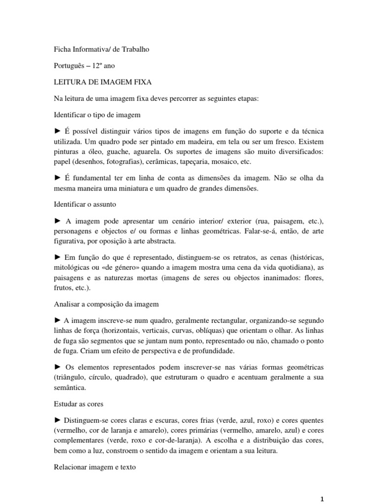 s etapas: Identificar o tipo de imagem possvel distinguir vrios tipos de imagens em funo do suporte e da tcnica utilizada. Um quadro pode ser pintado em madeira, em tela ou ser um fresco. Existem pinturas a leo, guache, aguarela. Os suportes de imagens so muito diversificados: papel (desenhos, fotografias), cermicas, tapearia, mosaico, etc. fundamental ter em linha de conta as dimenses da imagem. No se olha da mesma maneira uma miniatura e um quadro de grandes dimenses. Identificar o assunto A imagem pode apresentar um cenrio interior/ exterior (rua, paisagem, etc.), personagens e objectos e/ ou formas e linhas geomtricas. Falar-se-, ento, de arte figurativa, por oposio arte abstracta. Em funo do que representado, distinguem-se os retratos, as cenas (histricas, mitolgicas ou de gnero quando a imagem mostra uma cena da vida quotidiana), as paisagens e as naturezas mortas (imagens de seres ou objectos inanimados: flores, frutos, etc.). Analisar a composio da imagem A imagem inscreve-se num quadro, geralmente rectangular, organizando-se segundo linhas de fora (horizontais, verticais, curvas, oblquas) que orientam o olhar. As linhas de fuga so segmentos que se juntam num ponto, representado ou no, chamado o ponto de fuga. Criam um efeito de perspectiva e de profundidade. Os elementos representados podem inscrever-se nas vrias formas geomtricas (tringulo, crculo, quadrado), que estruturam o quadro e acentuam geralmente a sua semntica. Estudar as cores Distinguem-se cores claras e escuras, cores frias (verde, azul, roxo) e cores quentes (vermelho, cor de laranja e amarelo), cores primrias (vermelho, amarelo, azul) e cores complementares (verde, roxo e cor-de-laranja). A escolha e a distribuio das cores, bem como a luz, constroem o sentido da imagem e orientam a sua leitura. Relacionar imagem e texto
