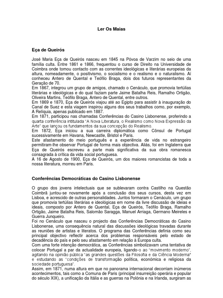 a) Da poca e da corrente literria Ea dizia na Conferncia do Casino: "O Realismo a anlise com o fito na verdade... a anatomia do carcter... o romance realista tem de nos transmitir a natureza em quadros exactssimos, flagrantes e reais". Em que medida Ea atingiu esse objectivo n' Os Maias? Na realidade Ea atinge os aspectos mais criticveis da poca: