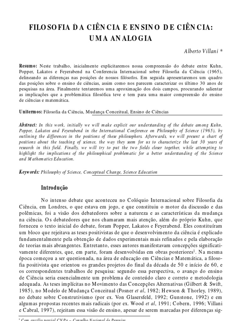 Resumo: Neste trabalho, inicialmente explicitaremos nossa compreenso do debate entre Kuhn, Popper, Lakatos e Feyerabend na Conferencia Internacional sobre Filosofia da Cincia (1965), delineando as diferenas nas posies de nossos filsofos. Em seguida apresentaremos um quadro das posies sobre o ensino de cincias, assim como nos parecem caracterizar os ltimo 30 anos de pesquisas na rea. Finalmente tentaremos uma aproximao dos dois campos, procurando salientar as implicaes que a problemtica filosfica teve e tem para uma maior compreenso do ensino de cincias e matemtica. Unitermos: Filosofia da Cincia, Mudana Conceitual, Ensino de Cincias Abstract: In this work, initially we will make explicit our understanding of the debate among Kuhn, Popper, Lakatos and Feyerabend in the International Conference on Philosophy of Science (1965), by outlining the differences in the positions of these philosophers. Afterwards, we will present a chart of positions about the teaching of science, the way they seem for us to characterize the last 30 years of research in this field. Finally, we will try to put the two fields closer together, while attempting to highlight the implications of the philosophical problematic for a better understanding of the Science and Mathematics Education. Keywords: Philosophy of Science, Conceptual Change, Science Education