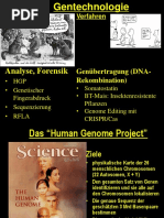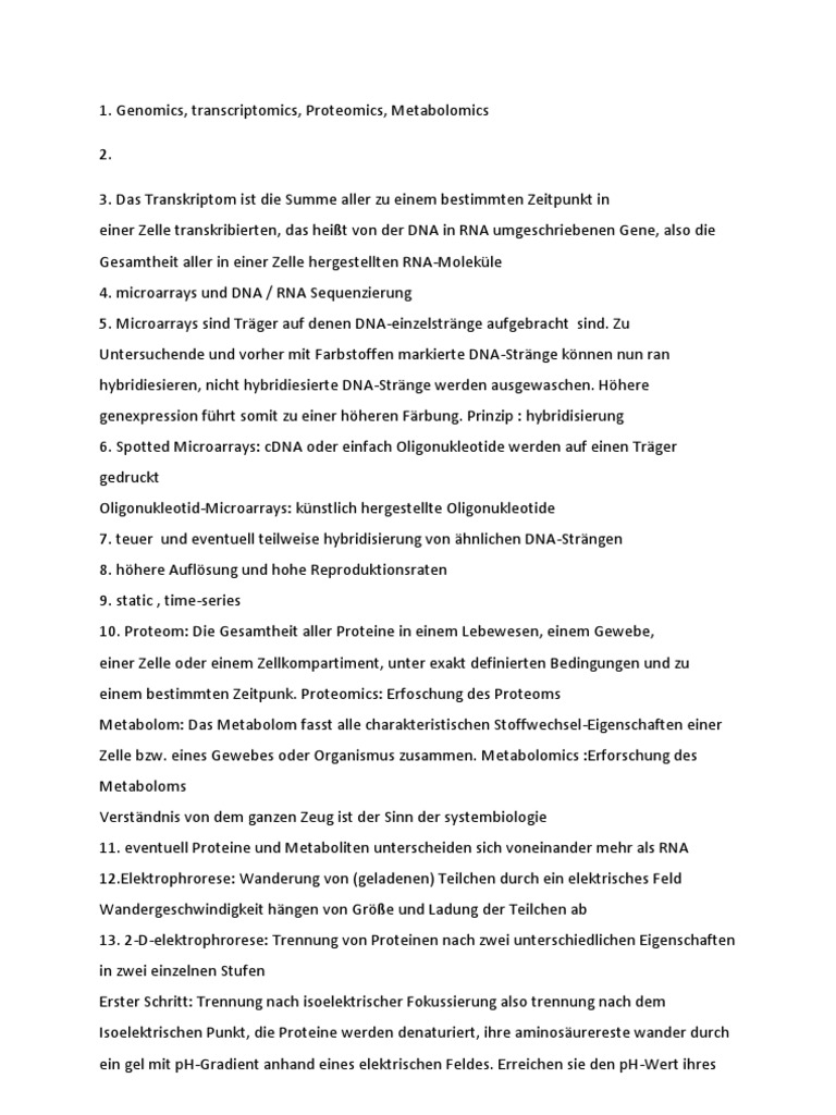 Das Transkriptom ist die Summe aller zu einem bestimmten Zeitpunkt in einer Zelle transkribierten, das heit von der DNA in RNA umgeschriebenen Gene, also die Gesamtheit aller in einer Zelle hergestellten RNA-Molekle 4. microarrays und DNA / RNA Sequenzierung 5. Microarrays sind Trger auf denen DNA-einzelstrnge aufgebracht sind. Zu Untersuchende und vorher mit Farbstoffen markierte DNA-Strnge knnen nun ran hybridiesieren, nicht hybridiesierte DNA-Strnge werden ausgewaschen. Hhere genexpression fhrt somit zu einer hheren Frbung. Prinzip : hybridisierung 6. Spotted Microarrays: cDNA oder einfach Oligonukleotide werden auf einen Trger gedruckt Oligonukleotid-Microarrays: knstlich hergestellte Oligonukleotide 7. teuer und eventuell teilweise hybridisierung von hnlichen DNA-Strngen 8. hhere Auflsung und hohe Reproduktionsraten 9. static , time-series 10. Proteom: Die Gesamtheit aller Proteine in einem Lebewesen, einem Gewebe, einer Zelle oder einem Zellkompartiment, unter exakt definierten Bedingungen und zu einem bestimmten Zeitpunk. Proteomics: Erfoschung des Proteoms Metabolom: Das Metabolom fasst alle charakteristischen Stoffwechsel-Eigenschaften einer Zelle bzw. eines Gewebes oder Organismus zusammen. Metabolomics :Erforschung des Metaboloms Verstndnis von dem ganzen Zeug ist der Sinn der systembiologie 11. eventuell Proteine und Metaboliten unterscheiden sich voneinander mehr als RNA [Link]: Wanderung von (geladenen) Teilchen durch ein elektrisches Feld Wandergeschwindigkeit hngen von Gre und Ladung der Teilchen ab 13. 2-D-elektrophrorese: Trennung von Proteinen nach zwei unterschiedlichen Eigenschaften in zwei einzelnen Stufen Erster Schritt: Trennung nach isoelektrischer Fokussierung also trennung nach dem Isoelektrischen Punkt, die Proteine werden denaturiert, ihre aminosurereste wander durch ein gel mit pH-Gradient anhand eines elektrischen Feldes. Erreichen sie den pH-Wert ihres