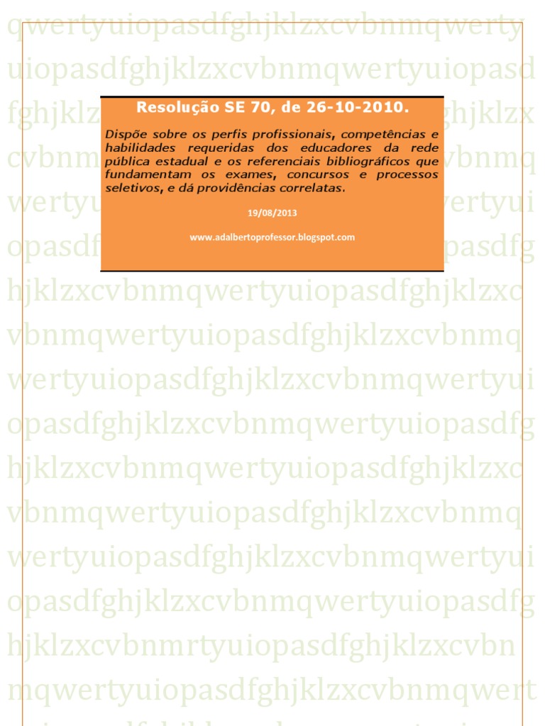O Secretrio da Educao, vista do que lhe representou o Comit Gestor para elaborao de provas de que trata a Resoluo SE n 69, de 1 .10.2009, resolve: Artigo 1- Fica aprovado o Anexo desta resoluo, que apresenta os perfis profissionais, competncias e habilidades requeridas dos educadores da rede pblica estadual nos exames, concursos e processos seletivos, promovidos por esta Pasta, e os referenciais bibliogrficos que fundamentam esses certames. Artigo 2 - Esta resoluo entra em vigor na data de sua publicao, ficando revogadas as disposies em contrrio, em especial as Res. SE ns 80, de 3.11.2009; 87, de 30.11.2009; 90, de 3.12.2009; 2, de 5.1.2010, e 9, de 27.1.2010. Perfis Profissionais e Referenciais Bibliogrficos para Exames, Concurso e/ou Processos Seletivos de Educadores PEB I, PEB II, Educao Especial, Educao Escolar Indgena, Diretor de Escola e Supervisor de Ensino 26 de Outubro de 2010 SUMRIO 1 PERFIS PROFISSIONAIS .............................................................................................4 1.1 PROFESSOR PEB-I - ENSINO FUNDAMENTAL ANOS INICIAIS (1 AO 5 ANO) .................4 1.1.1 Competncias Tcnica Gerais..................................................................................4 1.1.2 Fundamentao Pedaggica ...................................................................................5 1.1.3 Lngua Portuguesa................................................................................................7 1.1.4 Matemtica .......................................................................................................14 1.1.5 Conhecimentos Gerais (Histria, Geografia e Cincias) ................................. ..........18 1.2 PROFESSOR PEB-II - ENSINO FUNDAMENTAL ANOS FINAIS (6 AO 9 ANO) E/OU ENSINO MDIO ..................................................................................................22 1.2.1 Perfil: Comum a todas as reas ............................................................................22 1.2.2 Perfil: Lngua Portuguesa .....................................................................................28 1.2.3 Perfil: Arte ........................................................................................................31 1.2.4 Perfil: Educao Fsica .........................................................................................36 1.2.5 Perfil: Lngua Estrangeira Moderna - Ingls ........................................................ ...39 1.2.6 Perfil: Lngua Estrangeira Moderna - Espanhol ........................................................43 1.2.7 Perfil: Matemtica ..............................................................................................46 1.2.8 Perfil: Cincias ...................................................................................................51 1.2.9 Perfil: Fsica .......................................................................................................55 1.2.10 Perfil: Qumica .................................................................................................61 1.2.11 Perfil: Biologia ..................................................................................................66 1.2.12 Perfil: Histria ..................................................................................................70 1.2.13 Perfil: Geografia ...............................................................................................74 1.2.14 Perfil: Filosofia .................................................................................................79 1.2.15 Perfil: Sociologia ..............................................................................................82 1.2.16 Perfil: Psicologia ........................................................................................... ...86 1.2.17 Perfil: Lngua Estrangeira Moderna Alemo (CELs) .............................................89 1.2.18 Perfil: Lngua Estrangeira Moderna Espanhol (CELs) ...........................................90 1.2.19 Perfil: Lngua Estrangeira Moderna Francs (CELs) .............................................90 1.2.20 Perfil: Lngua Estrangeira Moderna Ingls (CELs) ...............................................90 1.2.21 Perfil: Lngua Estrangeira Moderna Italiano (CELs) .............................................90 1.2.22 Perfil: Lngua Estrangeira Moderna Japons (CELs) .............................................90 1.3 PROFESSOR - EDUCAO ESPECIAL ........................................................................91 1.3.1 Perfil: Educao Especial .....................................................................................91 1.4 PROFESSOR - EDUCAO ESCOLAR INDGENA .........................................................95 1.4.1 Perfil: Educao Escolar Indgena .........................................................................95 1.5 DIRETOR DE ESCOLA ............................................................................................97 1.5.1 Atribuies gerais................................................................................................97 1.5.2 Atribuies especficas da rea de atuao do Diretor de Escola ................................97 1.5.3 Competncias e Habilidades necessrias ao Diretor de Escola .................................100 1.6 SUPERVISOR DE ENSINO .....................................................................................103 1.6.1 Atribuies gerais..............................................................................................103 1.6.2 Atribuies especficas da rea de atuao do Supervisor de Ensino ........................103 1.6.3 Competncias e Habilidades necessrias ao Supervisor de Ensino ...........................106 2 REFERENCIAIS BIBLIOGRFICOS .............................................................................109 2.1 PROFESSOR PEB-I - ENSINO FUNDAMENTAL ANOS INICIAIS (1 AO 5 ANO) .............109 2.1.1 Livros e Artigos para o Professor PEB-I .............................