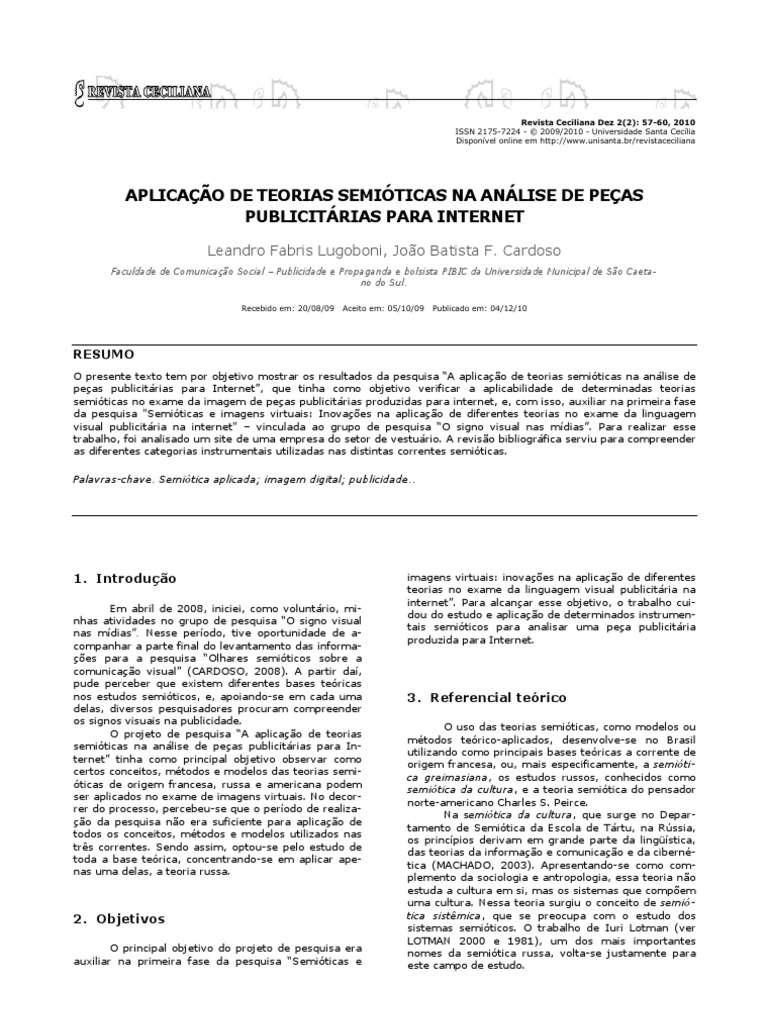 peças publicitárias para Internet”, que tinha como objetivo verificar a aplicabilidade de determinadas teorias semióticas no exame da imagem de peças publicitárias produzidas para internet, e, com isso, auxiliar na primeira fase da pesquisa "Semióticas e imagens virtuais: Inovações na aplicação de diferentes teorias no exame da linguagem visual publicitária na internet" – vinculada ao grupo de pesquisa “O signo visual nas mídias”. Para realizar esse