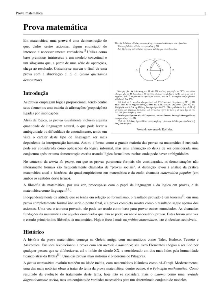 Em matemática, uma prova é uma demonstração de que, dados certos axiomas, algum enunciado de interesse é necessariamente verdadeiro. [] Utiliza como base premissas intrínsecas a um modelo conceitual e um silogismo que, a partir de uma série de operações, chega ao resultado. Costuma-se marcar o final de uma prova com a abreviação c. q. d. (como queríamos demonstrar).