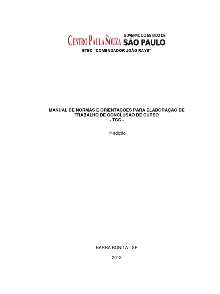 Estas diretrizes têm por objetivo padronizar a apresentação dos Trabalhos de Conclusão de Curso (TCCs) das Habilitações Técnicas de Nível Médio da Etec “Comendador João Rays”.