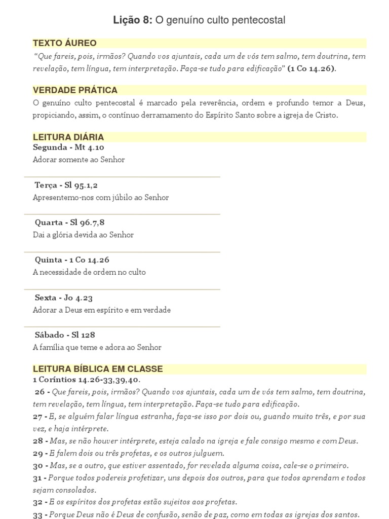 palavra, nem t-la como sinnimo de formalismo. Liturgia, de acordo com o grego, significa servio pblico. Nesse sentido, o culto cristo pode ser definido como um servio que, em esprito e em verdade, prestamos a Deus (Sl 100.2). Paulo apresenta a liturgia ideal para o culto cristo: Que fareis, pois, irmos? Quando vos ajuntais, cada um de vs tem salmo, tem doutrina, tem revelao, tem lngua, tem interpretao. Faa-se tudo para edificao (1 Co 12.26). Embora a igreja em Corinto fosse autenticamente pentecostal, o seu culto deveria primar pela boa conduo: Mas faa -se tudo decentemente e com ordem (1 Co 14.40). O culto deve ser racional e consciente, conforme exige a Palavra de Deus (Rm 12.1). Caso contrrio, ou cair no formalismo, ou em algo desordenado e sem forma. Queremos deixar bem claro que a liturgia realmente bblica jamais impedir a manifestao do poder de Deus, batismos com o Esprito Santo, curas divinas, milagres e, principalmente, salvao de almas. 2. Elementos do genuno culto pentecostal. Vejamos, a seguirmos elementos que, de acordo com Paulo, devem compor o verdadeiro culto cristo: a) Leitura da Palavra. No Antigo Testamento, a leitura e a dissertao das Sagradas Escrituras tinham um sentido especial no servio de adorao a Deus (Ed 8.1-12). Na Igreja Primitiva, quando o Novo Testamento ainda no havia sido escrito, os crentes utilizavam as Escrituras do Antigo Testamento em suas reunies (At 2.42; 17.11). Por conseguinte, o verdadeiro culto de adorao a Deus no pode ficar sem o ensino ou a pregao bblica. A sua igreja ouve regularmente a leitura da Palavra de Deus? O culto sem a leitura e a explanao das Sagradas Escrituras incompleto. b) Cnticos na adorao. Uma das formas mais expressivas da adorao crist manifestada atravs de hinos e cnticos (Ef 5.18-21). Infelizmente, essa rea da liturgia crist muito tem sofrido com a proliferao de msicas que, sublimando o homem, minimizam o Senhor. Por outro lado, glorificamos a Deus porque nosso hinrio oficial, a Harpa Crist, tem como o seu primeiro compromisso exaltar o Senhor alm de cantar as doutrinas da Bblia Sagrada. c) As oraes e as ofertas voluntrias. Os crentes na Igreja Primitiva, por no disporem de templos, oravam nas casas. Os de Jerusalm oravam tambm no Santo Templo (At 3.1; 4.23,24; 12.12). Alm da orao, eles adoravam a Deus com a entrega voluntria de dzimos e ofertas (1 Co 16.2; 2 Co 9.7; Fp 4.18). A orao e a intercesso jamais devem ausentar-se do culto pentecostal.