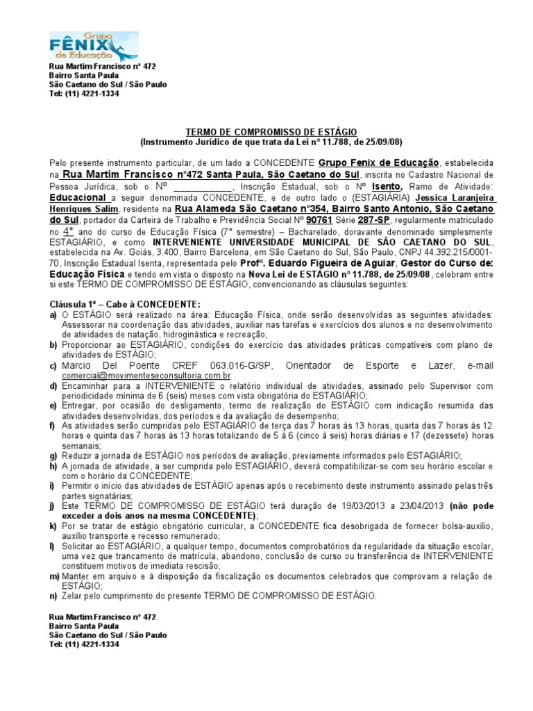 TERMO DE COMPROMISSO DE ESTGIO (Instrumento Jurdico de que trata da Lei n 11.788, de 25/09/08) Pelo presente instrumento particular, de um lado a CONCEDENTE Grupo Fenix de Educao, estabelecida na Rua Martim Francisco n472 Santa Paula, So Caetano do Sul, inscrita no Cadastro Nacional de Pessoa Jurdica, sob o N __________, Inscrio Estadual, sob o N Isento, Ramo de Atividade: Educacional a seguir denominada CONCEDENTE, e de outro lado o (ESTAGIRIA) Jessica Laranjeira Henriques Salim, residente na Rua Alameda So Caetano n354, Bairro Santo Antonio, So Caetano do Sul, portador da Carteira de Trabalho e Previdncia Social N 90761 Srie 287-SP, regularmente matriculado no 4 ano do curso de Educao Fsica (7 semestre) Bacharelado, doravante denominado simplesmente ESTAGIRIO, e como INTERVENIENTE UNIVERSIDADE MUNICIPAL DE SO CAETANO DO SUL, estabelecida na Av. Gois, 3.400, Bairro Barcelona, em So Caetano do Sul, So Paulo, CNPJ 44.392.215/000170, Inscrio Estadual Isenta, representada pelo Prof. Eduardo Figueira de Aguiar, Gestor do Curso de: Educao Fsica e tendo em vista o disposto na Nova Lei de ESTGIO n 11.788, de 25/09/08 , celebram entre si este TERMO DE COMPROMISSO DE ESTGIO, convencionando as clusulas seguintes: Clusula 1 Cabe CONCEDENTE: a) O ESTGIO ser realizado na rea: Educao Fsica, onde sero desenvolvidas as seguintes atividades: Assessorar na coordenao das atividades, auxiliar nas tarefas e exerccios dos alunos e no desenvolvimento de atividades de natao, hidroginstica e recreao; b) Proporcionar ao ESTAGIRIO, condies do exerccio das atividades prticas compatveis com plano de atividades de ESTGIO; c) Marcio Del Poente CREF 063.016-G/SP, Orientador de Esporte e Lazer, e-mail comercial@movimenteseconsultoria.com.br d) Encaminhar para a INTERVENIENTE o relatrio individual de atividades, assinado pelo Supervisor com periodicidade mnima de 6 (seis) meses com vista obrigatria do ESTAGIRIO; e) Entregar, por ocasio do desligamento, termo de realizao do ESTGIO com indicao resumida das atividades desenvolvidas, dos perodos e da avaliao de desempenho; f) As atividades sero cumpridas pelo ESTAGIRIO de tera das 7 horas s 13 horas, quarta das 7 horas s 12 horas e quinta das 7 horas s 13 horas totalizando de 5 6 (cinco seis) horas dirias e 17 (dezessete) horas semanais; g) Reduzir a jornada de ESTGIO nos perodos de avaliao, previamente informados pelo ESTAGIRIO; h) A jornada de atividade, a ser cumprida pelo ESTAGIRIO, dever compatibilizar-se com seu horrio escolar e com o horrio da CONCEDENTE; i) Permitir o incio das atividades de ESTGIO apenas aps o recebimento deste instrumento assinado pelas trs partes signatrias; j) Este TERMO DE COMPROMISSO DE ESTGIO ter durao de 19/03/2013 a 23/04/2013 (no pode exceder a dois anos na mesma CONCEDENTE); k) Por se tratar de estgio obrigatrio curricular, a CONCEDENTE fica desobrigada de fornecer bolsa-auxilio, auxlio transporte e recesso remunerado; l) Solicitar ao ESTAGIRIO, a qualquer tempo, documentos comprobatrios da regularidade da situao escolar, uma vez que trancamento de matrcula, abandono, concluso de curso ou transferncia de INTERVENIENTE constituem motivos de imediata resciso; m) Manter em arquivo e disposio da fiscalizao os documentos celebrados que comprovam a relao de ESTGIO; n) Zelar pelo cumprimento do presente TERMO DE COMPROMISSO DE ESTGIO.