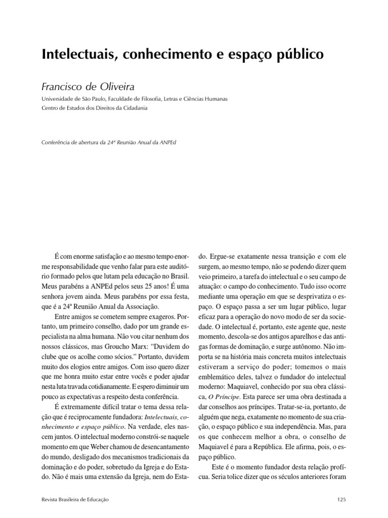 com enorme satisfao e ao mesmo tempo enorme responsabilidade que venho falar para este auditrio formado pelos que lutam pela educao no Brasil. Meus parabns a ANPEd pelos seus 25 anos! uma senhora jovem ainda. Meus parabns por essa festa, que a 24 Reunio Anual da Associao. Entre amigos se cometem sempre exageros. Portanto, um primeiro conselho, dado por um grande especialista na alma humana. No vou citar nenhum dos nossos clssicos, mas Groucho Marx: Duvidem do clube que os acolhe como scios. Portanto, duvidem muito dos elogios entre amigos. Com isso quero dizer que me honra muito estar entre vocs e poder ajudar nesta luta travada cotidianamente. E espero diminuir um pouco as expectativas a respeito desta conferncia. extremamente difcil tratar o tema dessa relao que reciprocamente fundadora: Intelectuais, conhecimento e espao pblico. Na verdade, eles nascem juntos. O intelectual moderno constri-se naquele momento em que Weber chamou de desencantamento do mundo, desligado dos mecanismos tradicionais da dominao e do poder, sobretudo da Igreja e do Estado. No mais uma extenso da Igreja, nem do EstaRevista Brasileira de Educao