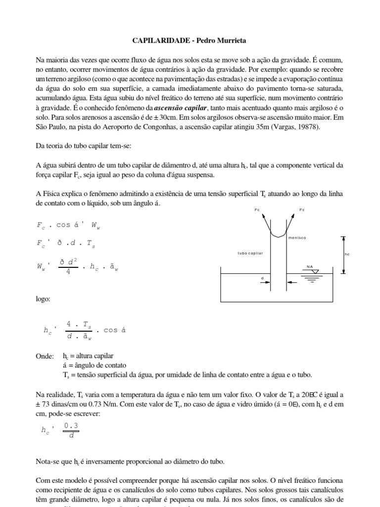 a ao da gravidade. comum, no entanto, ocorrer movimentos de gua contrrios ao da gravidade. Por exemplo: quando se recobre um terreno argiloso (como o que acontece na pavimentao das estradas) e se impede a evaporao contnua da gua do solo em sua superfcie, a camada imediatamente abaixo do pavimento torna-se saturada, acumulando gua. Esta gua subiu do nvel fretico do terreno at sua superfcie, num movimento contrrio gravidade. o conhecido fenmeno da ascenso capilar, tanto mais acentuado quanto mais argiloso o solo. Para solos arenosos a ascenso de 30cm. Em solos argilosos observa-se ascenso muito maior. Em So Paulo, na pista do Aeroporto de Congonhas, a ascenso capilar atingiu 35m (Vargas, 19878). Da teoria do tubo capilar tem-se: A gua subir dentro de um tubo capilar de dimentro d, at uma altura hc, tal que a componente vertical da fora capilar Fc, seja igual ao peso da coluna d'gua suspensa. A Fsica explica o fenmeno admitindo a existncia de uma tenso superficial Ts atuando ao longo da linha de contato com o lquido, sob um ngulo .