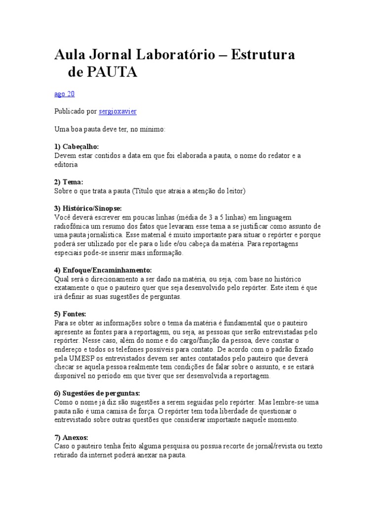 ago 20 Publicado por sergioxavier Uma boa pauta deve ter, no mnimo: 1) Cabealho: Devem estar contidos a data em que foi elaborada a pauta, o nome do redator e a editoria 2) Tema: Sobre o que trata a pauta (Ttulo que atraia a ateno do leitor) 3) Histrico/Sinopse: Voc dever escrever em poucas linhas (mdia de 3 a 5 linhas) em linguagem radiofnica um resumo dos fatos que levaram esse tema a se justificar como assunto de uma pauta jornalstica. Esse material muito importante para situar o reprter e porque poder ser utilizado por ele para o lide e/ou cabea da matria. Para reportagens especiais pode-se inserir mais informao. 4) Enfoque/Encaminhamento: Qual ser o direcionamento a ser dado na matria, ou seja, com base no histrico exatamente o que o pauteiro quer que seja desenvolvido pelo reprter. Este item que ir definir as suas sugestes de perguntas. 5) Fontes: Para se obter as informaes sobre o tema da matria fundamental que o pauteiro apresente as fontes para a reportagem, ou seja, as pessoas que sero entrevistadas pelo reprter. Nesse caso, alm do nome e do cargo/funo da pessoa, deve constar o endereo e todos os telefones possveis para contato. De acordo com o padro fixado pela UMESP os entrevistados devem ser antes contatados pelo pauteiro que dever checar se aquela pessoa realmente tem condies de falar sobre o assunto, e se estar disponvel no perodo em que tiver que ser desenvolvida a reportagem. 6) Sugestes de perguntas: Como o nome j diz so sugestes a serem seguidas pelo reprter. Mas lembre-se uma pauta no uma camisa de fora. O reprter tem toda liberdade de questionar o entrevistado sobre outras questes que considerar importante naquele momento. 7) Anexos: Caso o pauteiro tenha feito alguma pesquisa ou possua recorte de jornal/revista ou texto retirado da internet poder anexar na pauta.