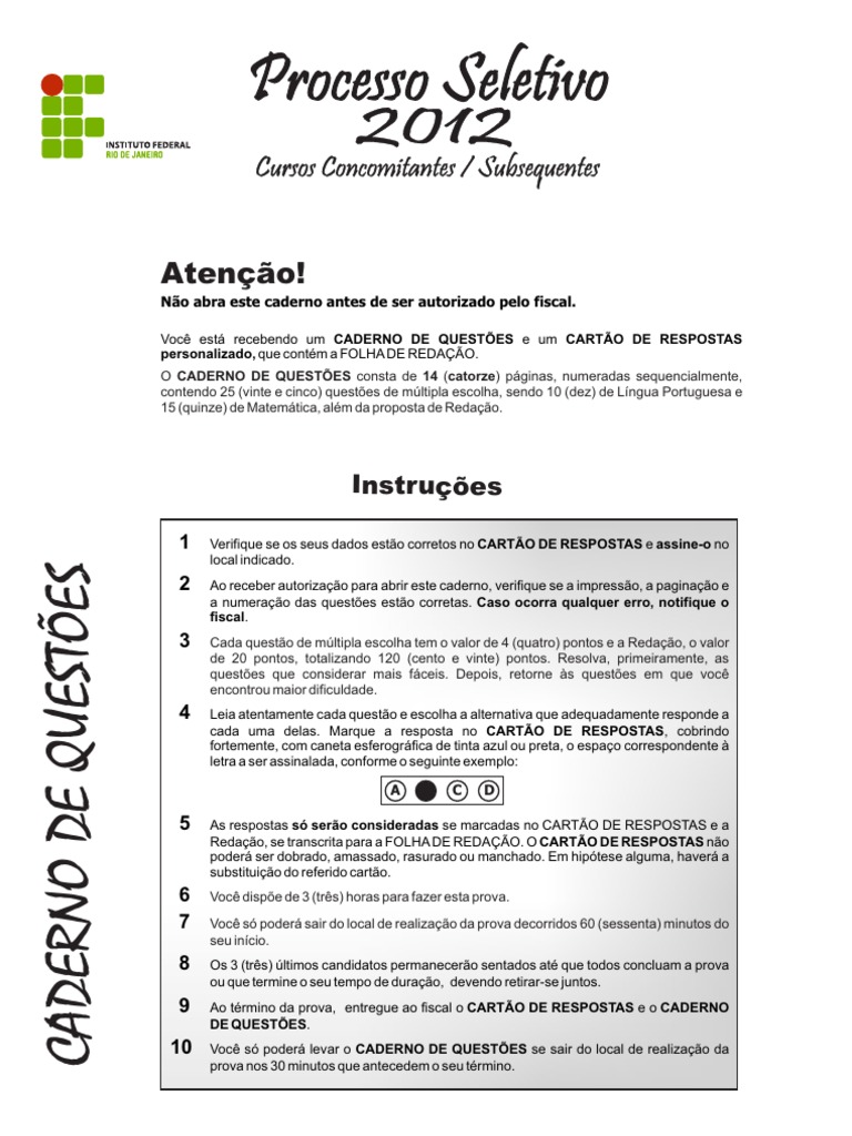 IFRJ Processo Seletivo 2012 Educao Profissional Tcnica de Nvel Mdio Concomitante ou Subsequente ao Ensino Mdio