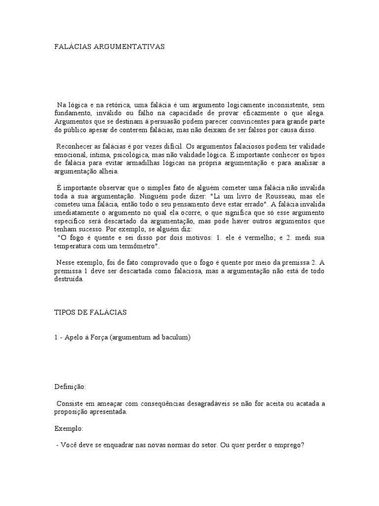- melhor exterminar os bandidos: voc poder ser a prxima vtima. - Cala essa tua boca, ou no te dou o dinheiro para o show. - Ou ns, ou a desgraa, o caos. Contra-argumentao: Argumente que apelar fora no racional, no argumento, que a emoo no tem relao com a verdade ou a falsidade da proposio.